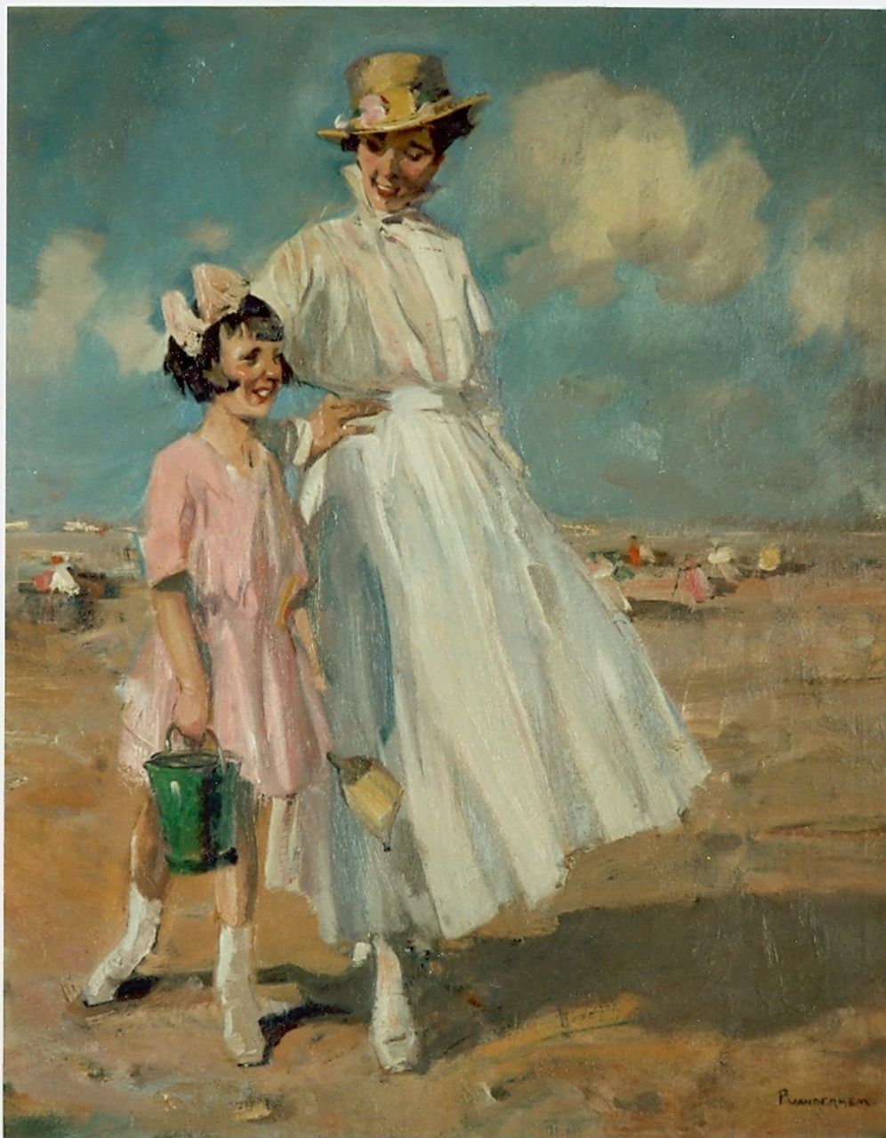 Piet van der Hem Kunstwerk • Gemälde • zuvor zu verkaufen A beach scene with mother and daughter strolling