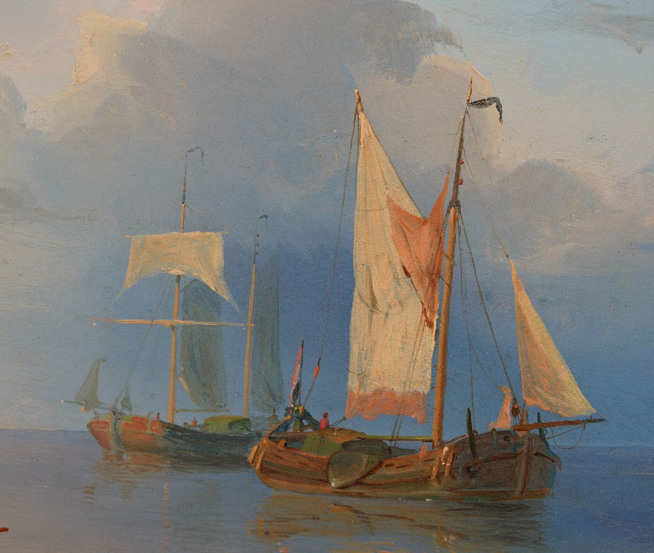 Pieter Cornelis Dommershuijzen Kunstwerk • Gemälde • zu verkaufen Flußlandschaft mit Segelschiffen bei Sonnenaufgang