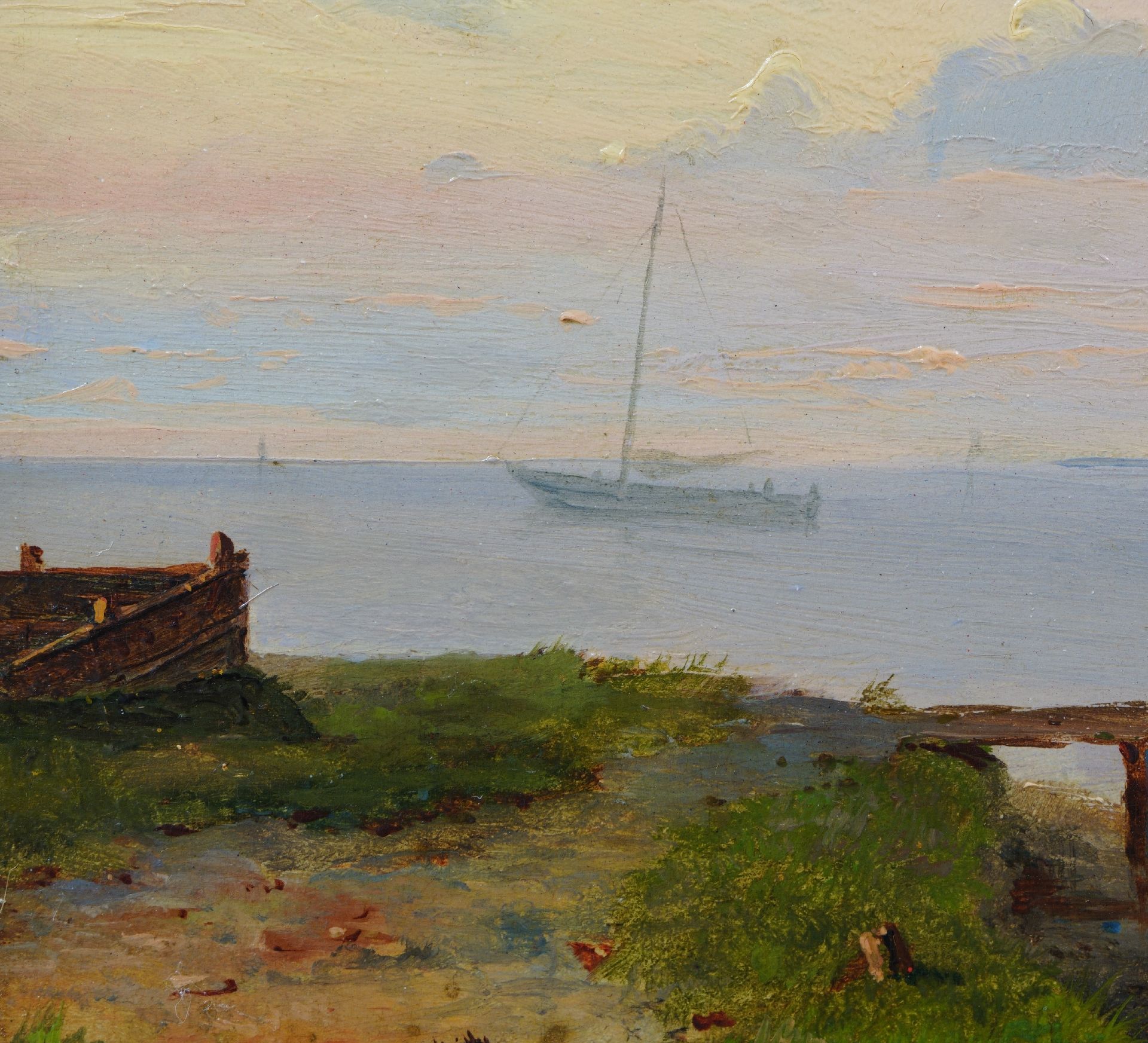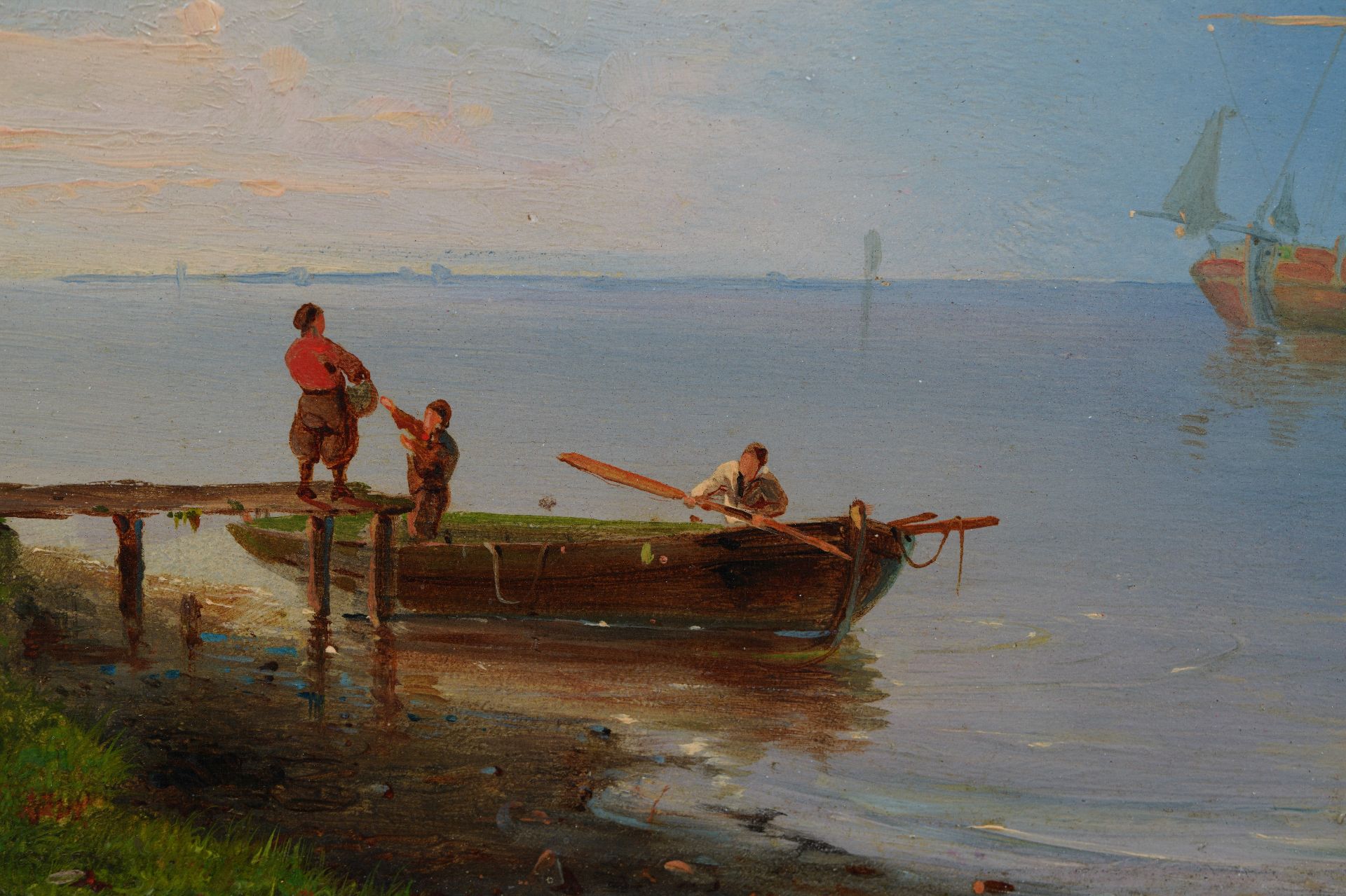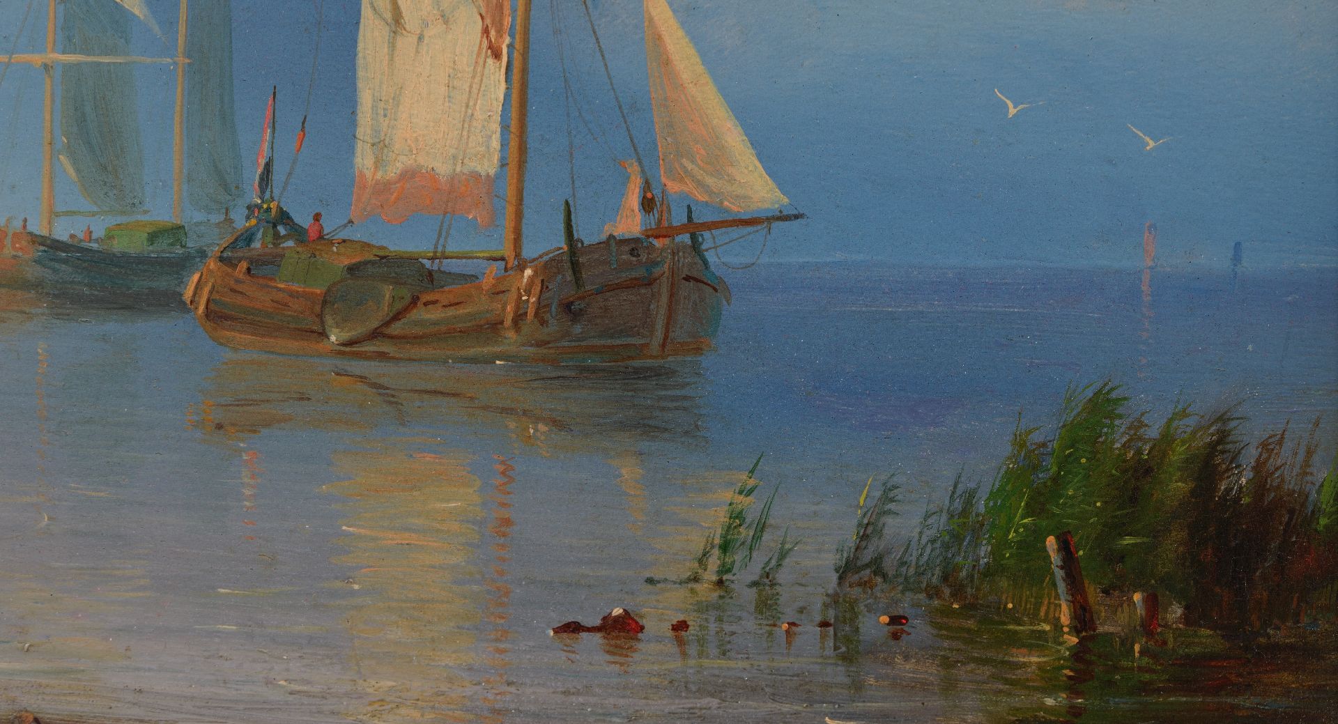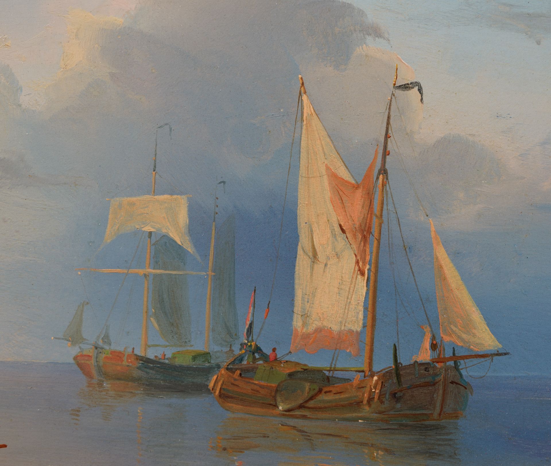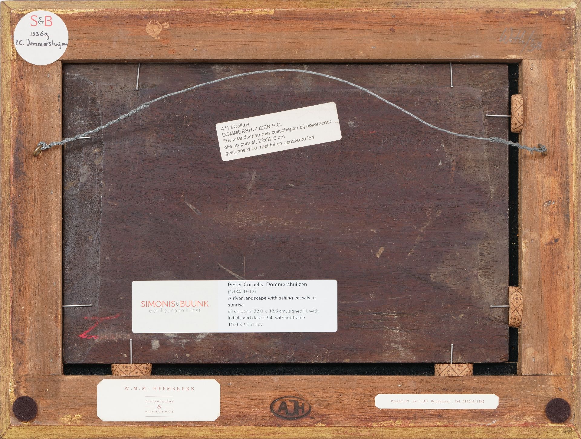 Pieter Cornelis Dommershuijzen Kunstwerk • Gemälde • zu verkaufen Flußlandschaft mit Segelschiffen bei Sonnenaufgang