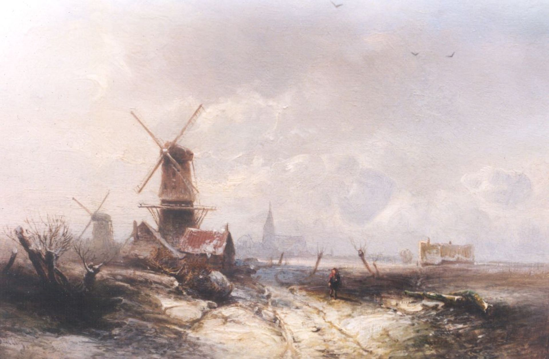 A winter landscape with windmills