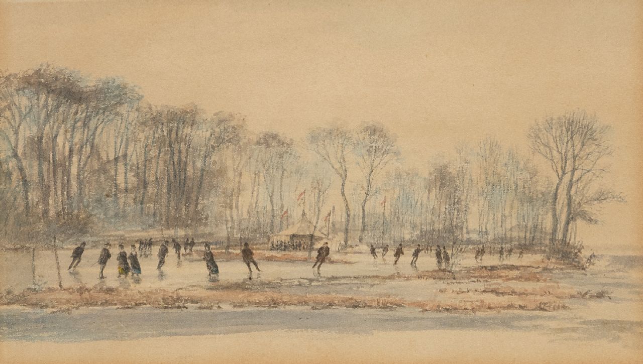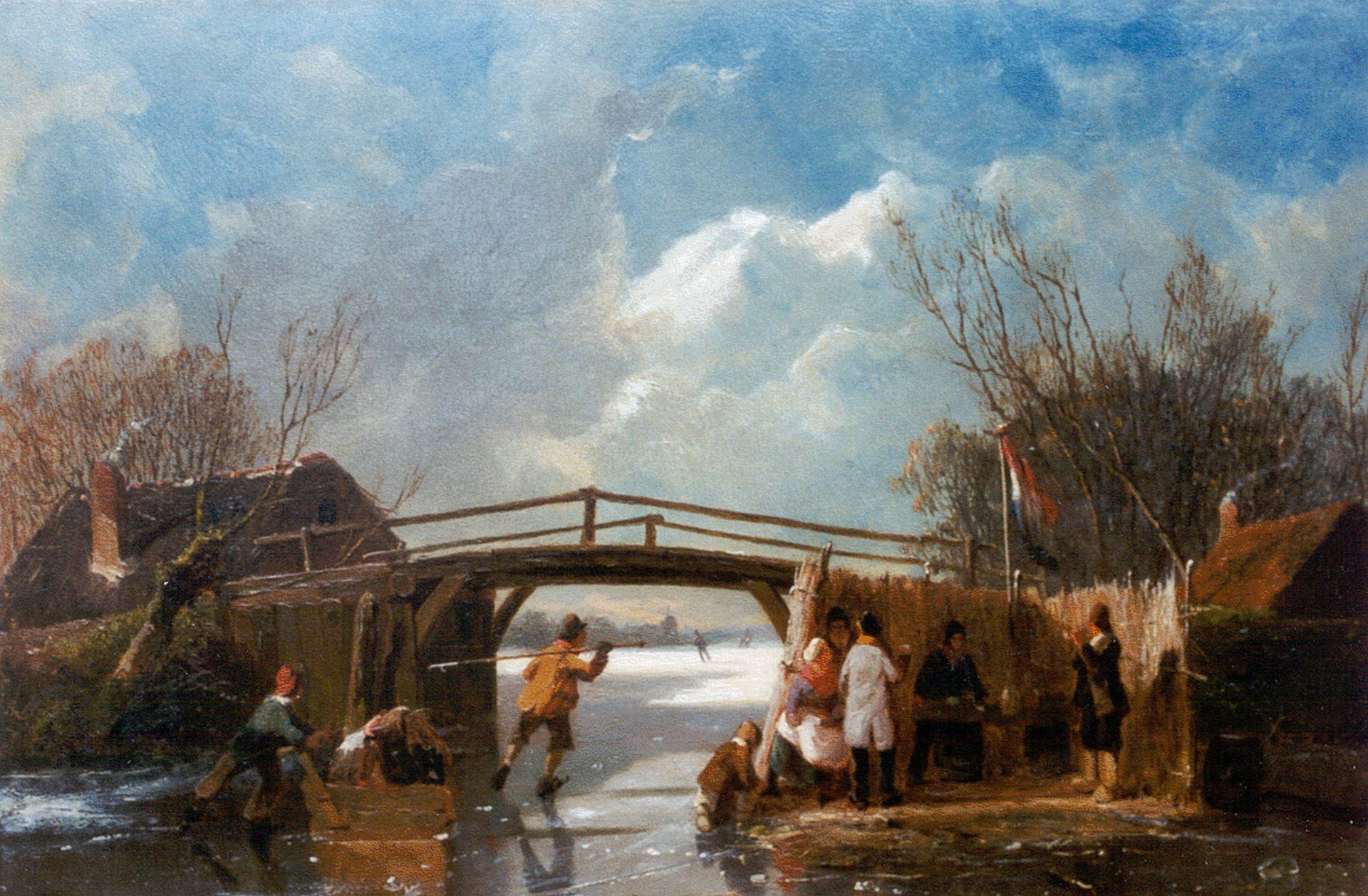 Pieter van Borselen Kunstwerk • Gemälde • zuvor zu verkaufen A winter landscape with skaters on the ice