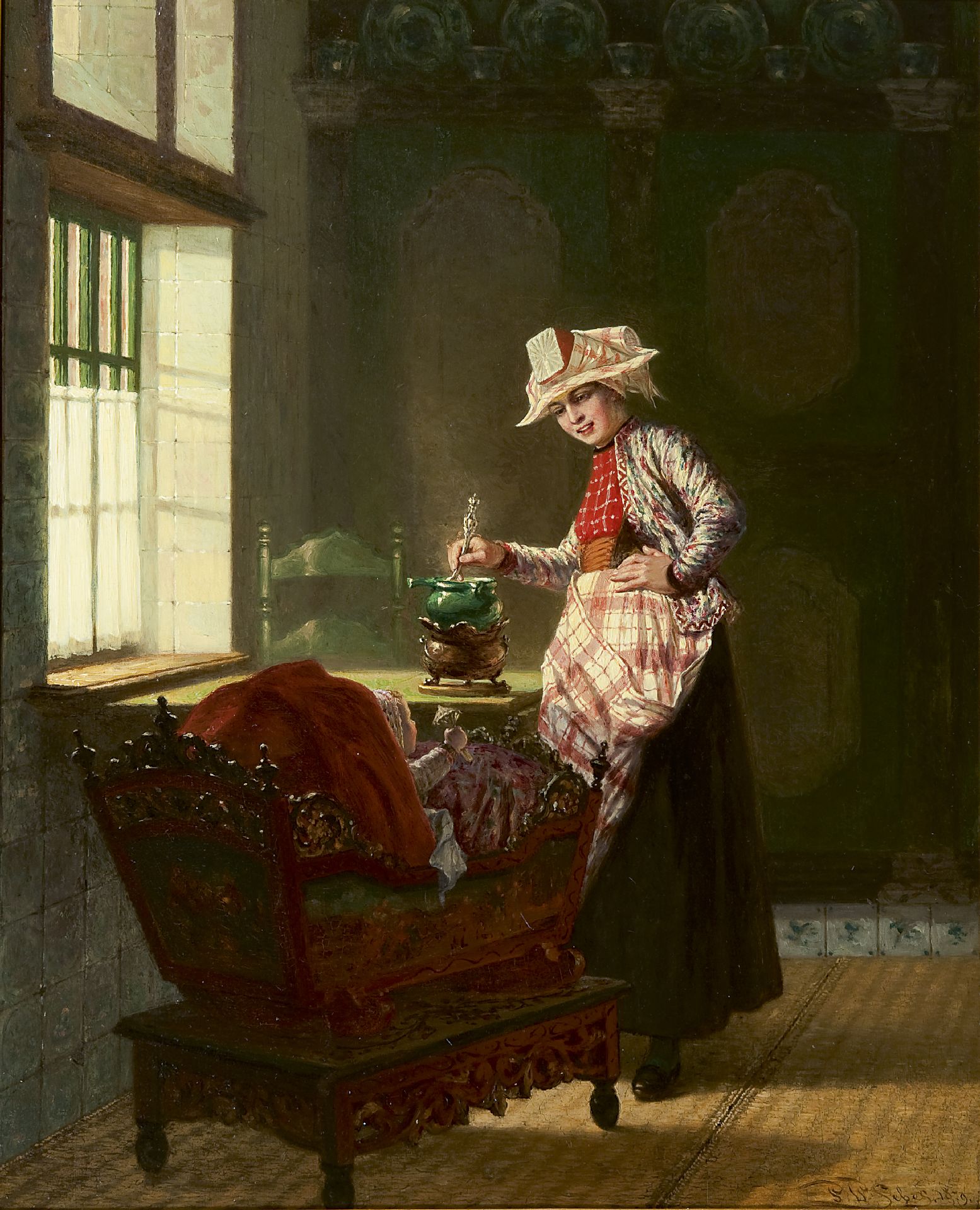 Pieter Willem Sebes Kunstwerk • Gemälde • zuvor zu verkaufen An interior in Hindeloopen with mother and child
