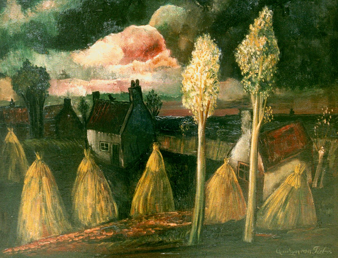 Quirijn van Tiel begann seine Karriere als expressionistischer Maler um 1920 in Rotterdam, beeinflusst vom flämischen Expressionismus von Constant Permeke. Er fand seine Motive rund um Rotterdam und auf den Zeeland-Inseln: etwas düstere Szenen mit schweren Wolken über verlassenen Poldern. Gemeinsame Motive waren auch Tiere und Bauern, die mit ihrem Land aufgewachsen sind. Nach 1936 wechselte Van Tiel zu einem primitiven surrealistischen Stil und sein Werk enthält fast immer eine Mischung aus Symbolik, Poesie und Realismus. Unter dem Einfluss von Rouault kam er später dazu, Figuren mit starken Konturen zu malen. Nach dem Krieg führen seine Stilexperimente zu einem abstrakten Expressionismus, der schließlich in einer geometrischen Formensprache mündet.