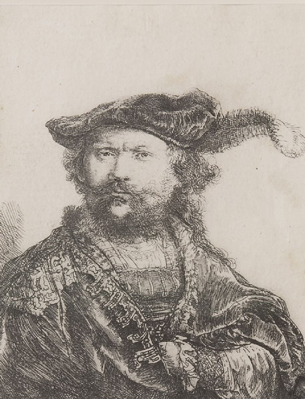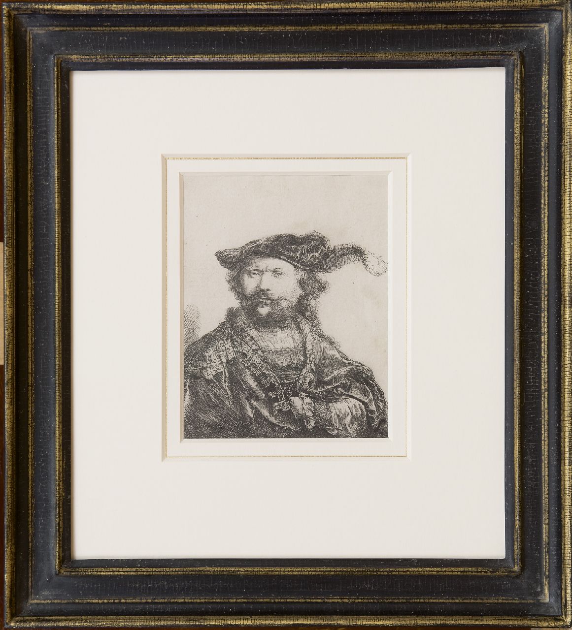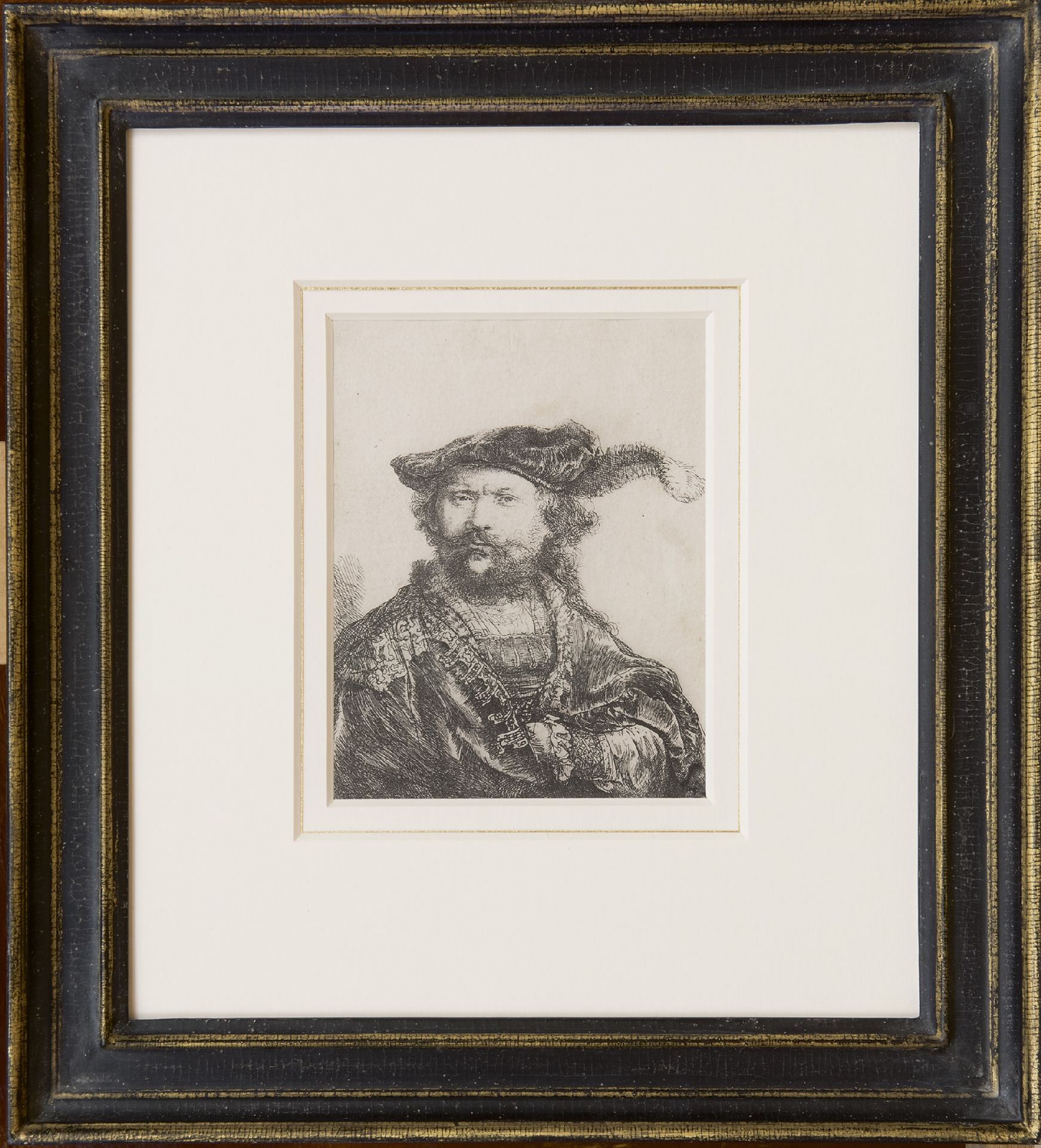 Rembrandt Kunstwerk • Grafik • zuvor zu verkaufen Selbstporträt in samtenem Barett mit Feder