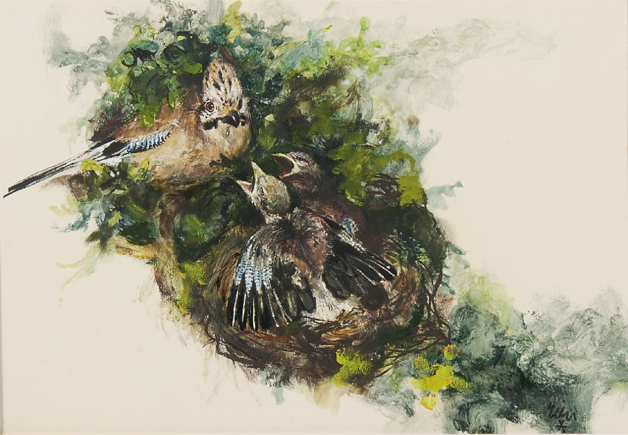 Rien Poortvliet Kunstwerk • Aquarell • Zeichnung • zuvor zu verkaufen A Jay feeding it's young