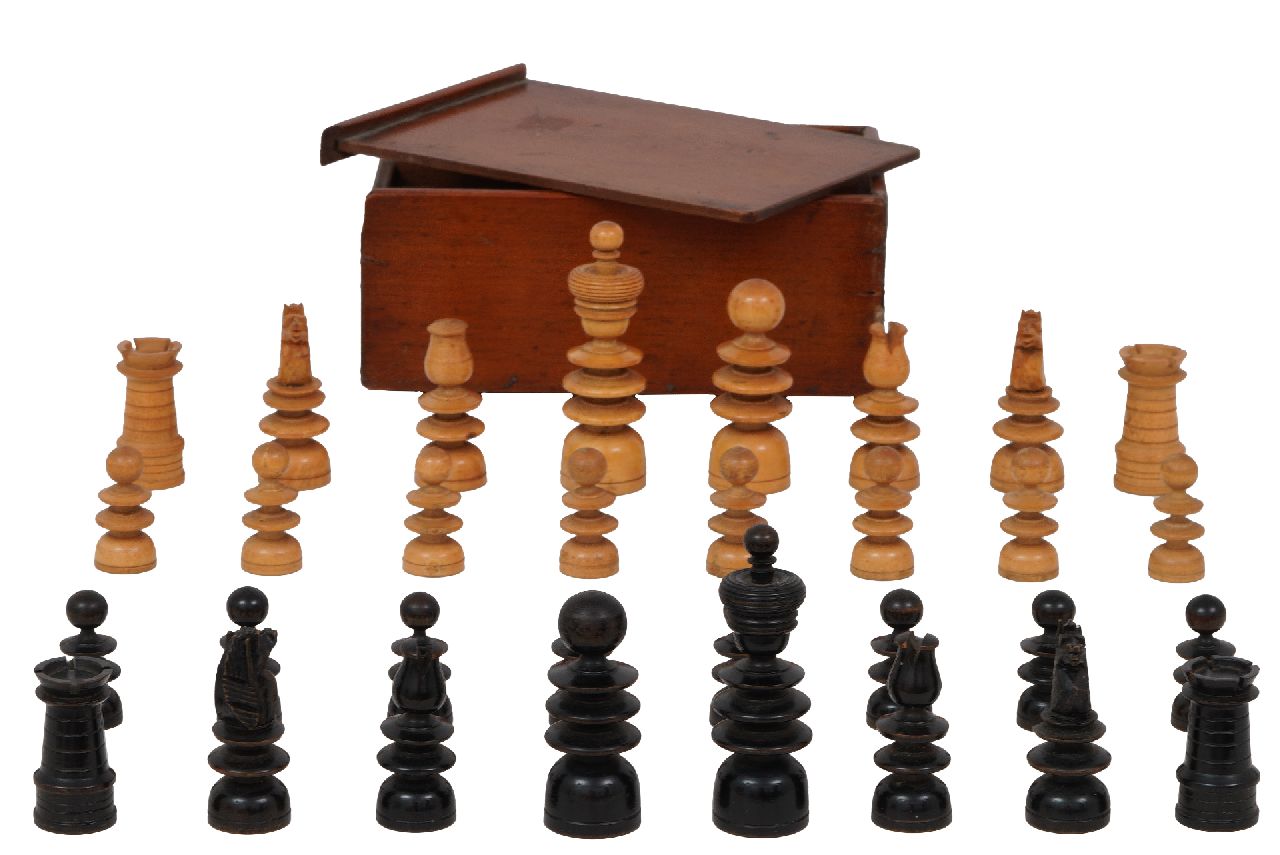 Schaakset, opbergdoos Kunstwerk • Bild • Skulptur • zu verkaufen English St George pattern boxwood and ebonized playing set in mahogany box