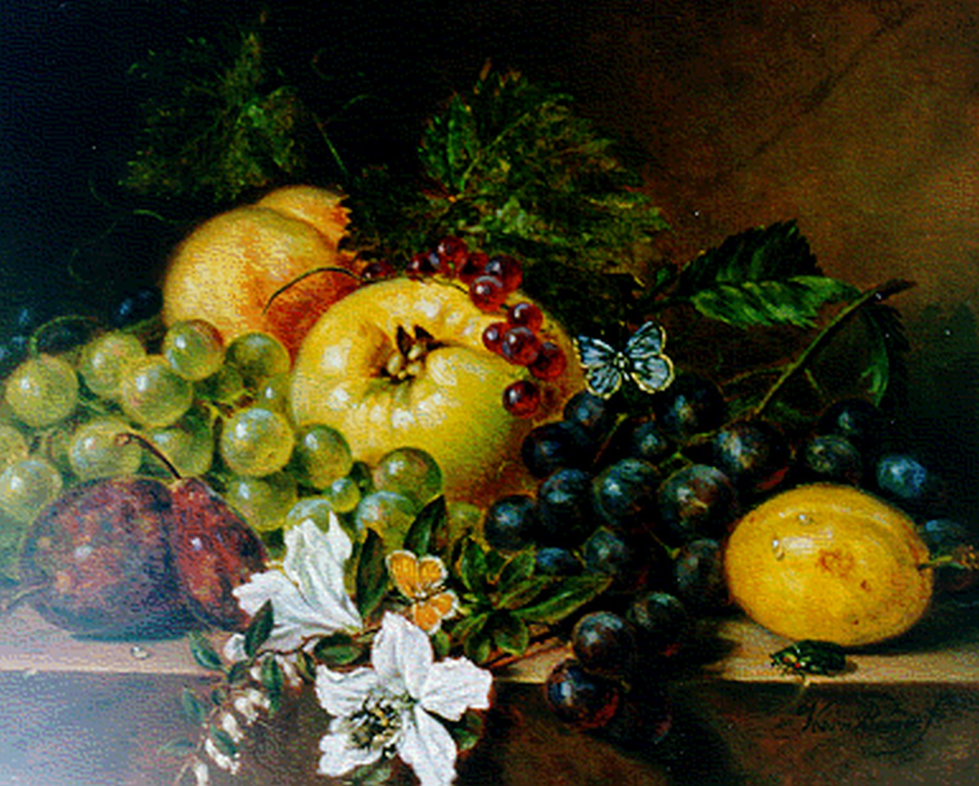 Sebastiaan Theodorus Voorn Boers Kunstwerk • Gemälde • zuvor zu verkaufen A still life with grapes, prunes, flowers and a butterfly