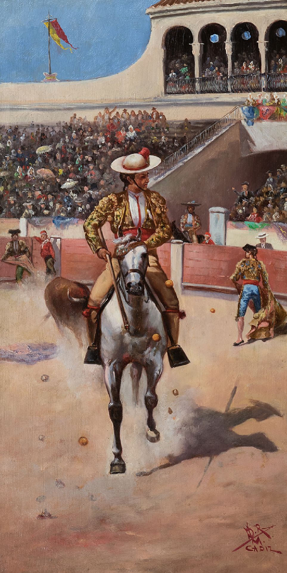 Spaanse School, begin 20e eeuw | Stierkampf, Torero in Aktion, Cadiz, Öl auf Holz, 42,5 x 22,3 cm, Unterzeichnet r.u. mit Initialen
