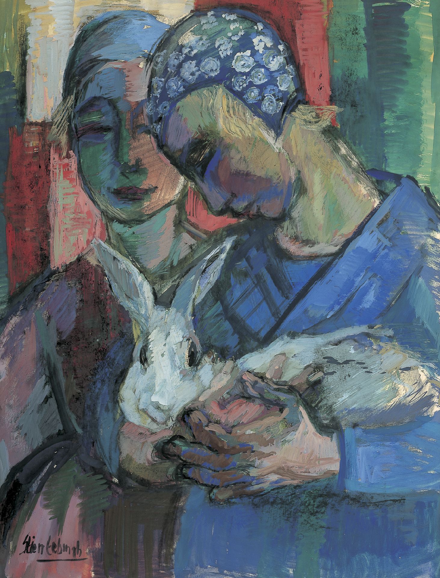 Stien Eelsingh Kunstwerk • Aquarell • Zeichnung • zuvor zu verkaufen Two 'Staphorster' girls with a rabbit