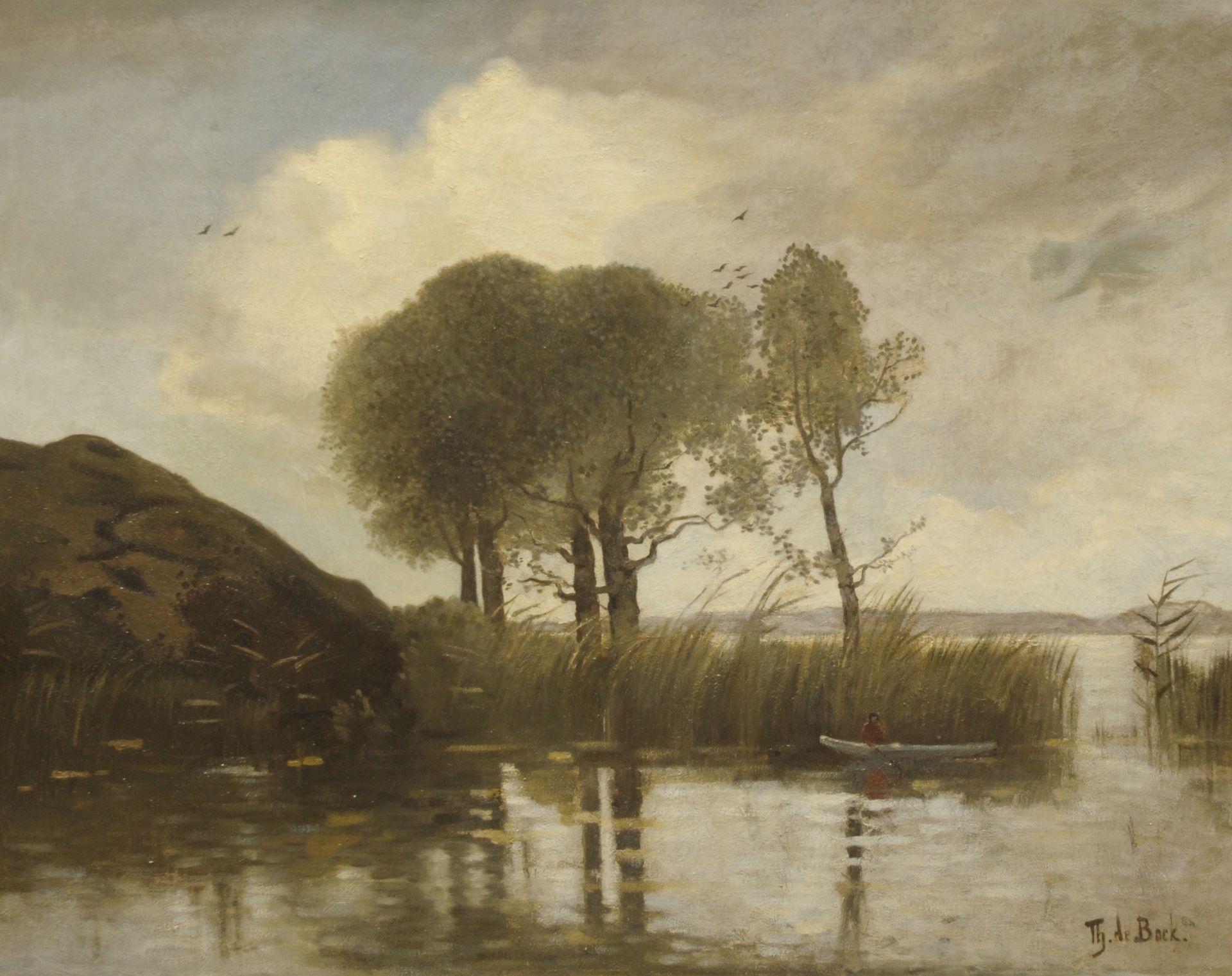 Théophile de Bock Kunstwerk • Gemälde • zuvor zu verkaufen Trees near the waterfront with small fishingboat