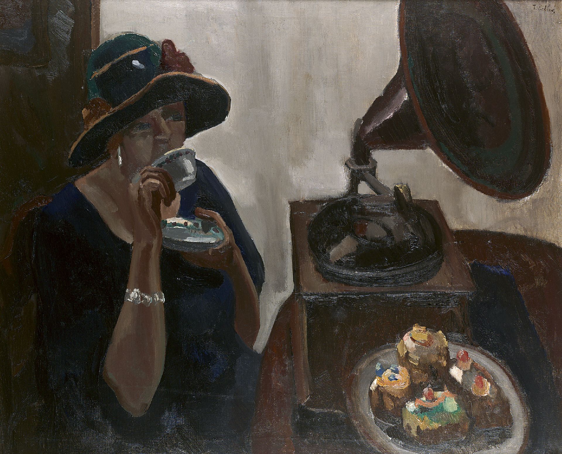 Toon Kelder Kunstwerk • Gemälde • zu verkaufen Dame beim Tee trinken mit Törtchen und Grammofon