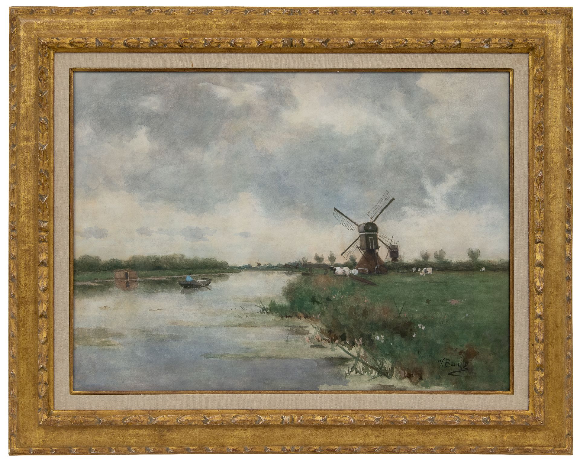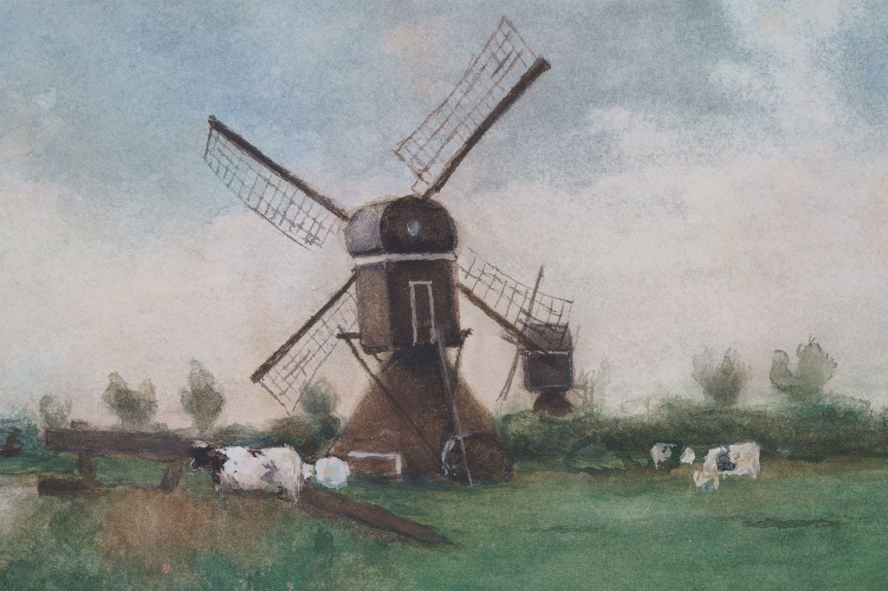 Victor Bauffe Kunstwerk • Aquarell • Zeichnung • zu verkaufen Mühle an einem Polderkanal