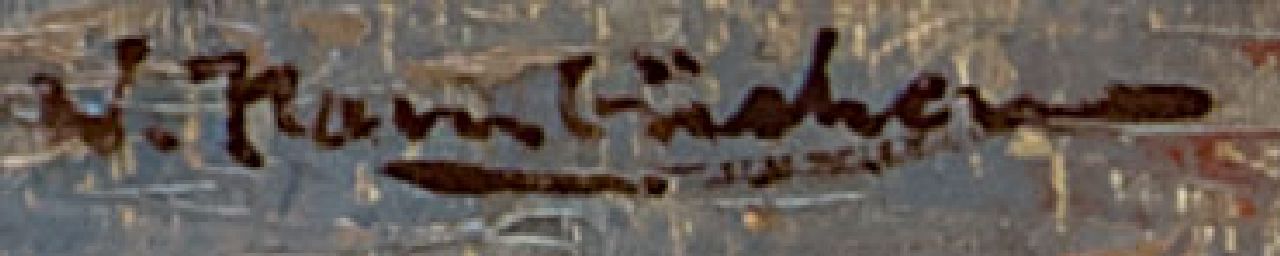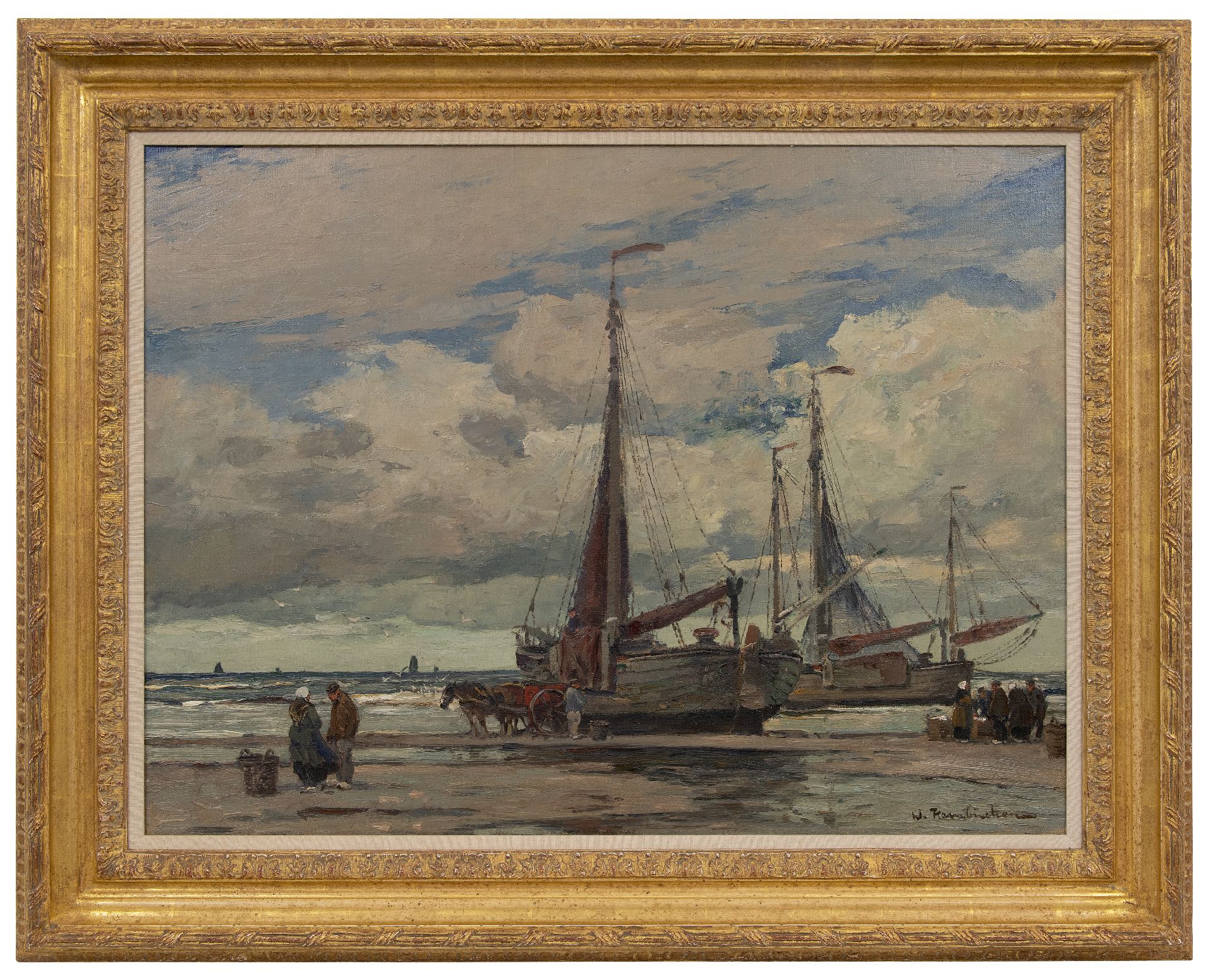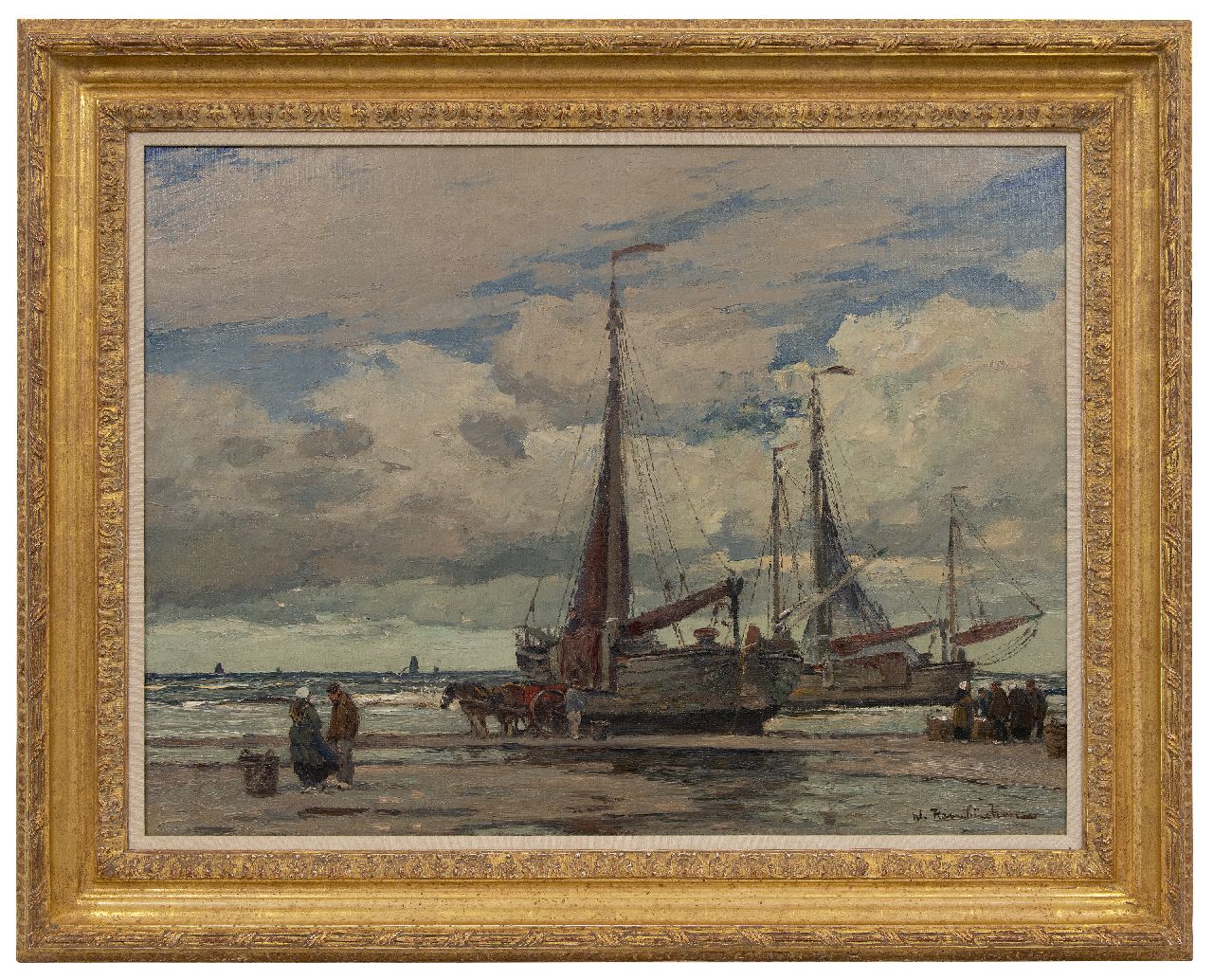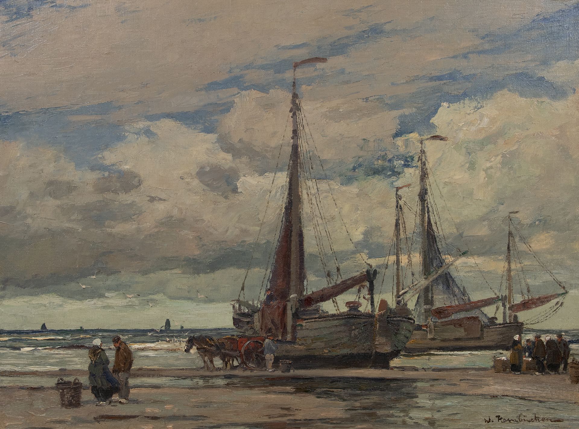 Bomschiffe, die Fischversteigerung auf dem Strand und das Meer bei Katwijk sind einige der geliebten Gegenstände des Malers Wihelm Hambüchen. Im Sog vieler anderer deutschen Künstler zog er kurz nach 1900 zum ersten Mal nach diesem geliebten holländischen Küstenort um dort das malerische Fischerleben zu malen. Er kehrte da wohlgemerkt 50 Jahre lang jeden Sommer immer wieder zurück. Unermüdet, und mit breiten, flotten Pinselstrichen malte er die charakteristischen Fischerboote, das flache Strand unter immer wechselndem bewölktem Himmel, und die lebhaften Gruppen mit Figuren zusammen nach dem Einlaufen der Boote.