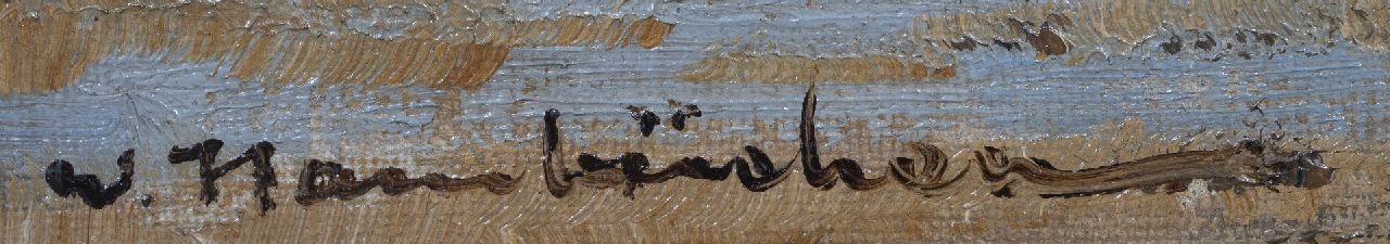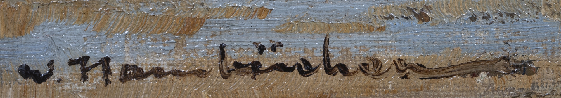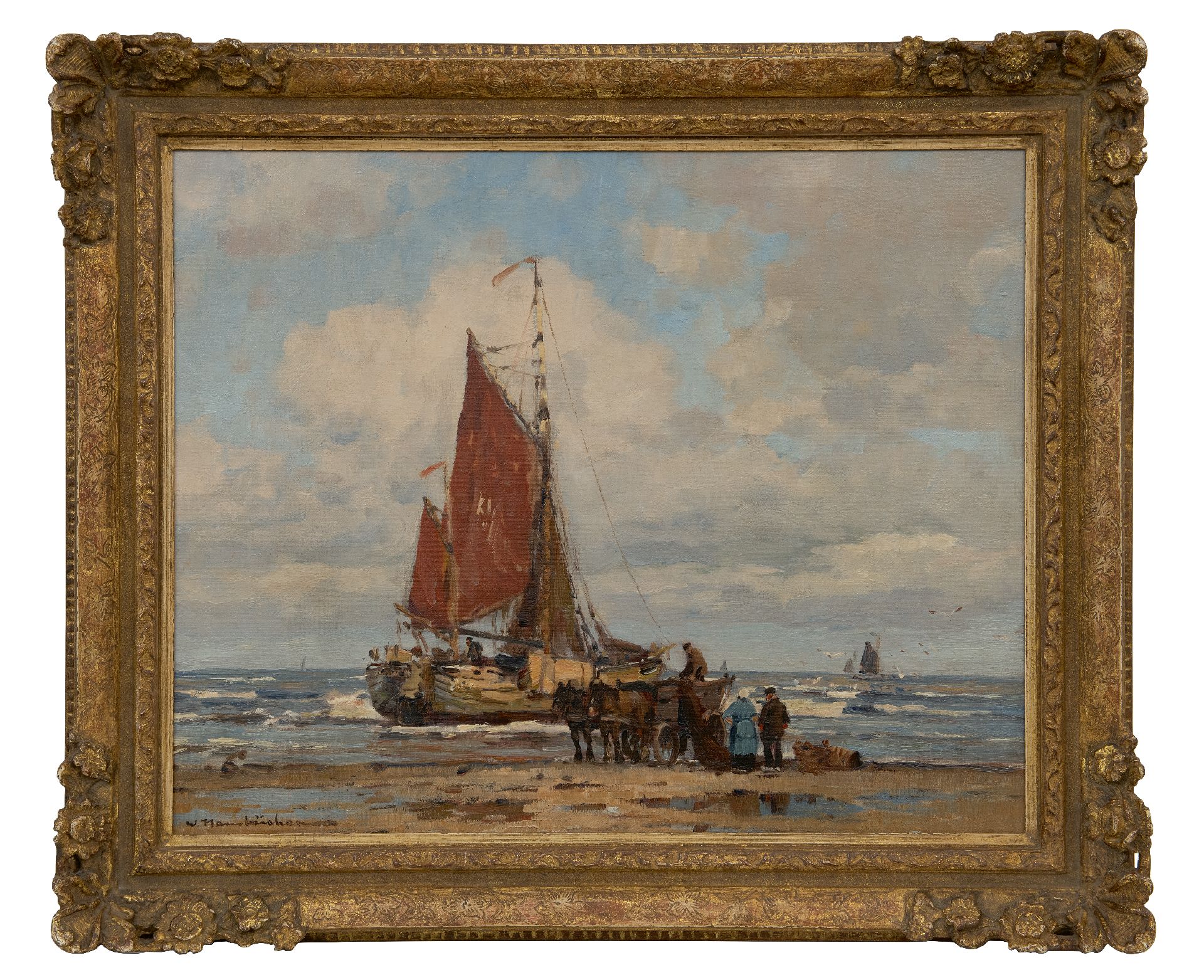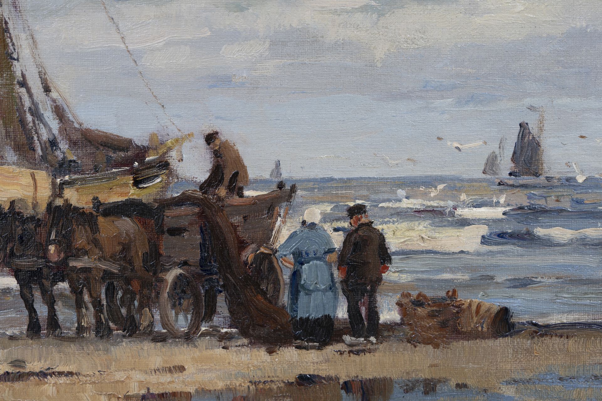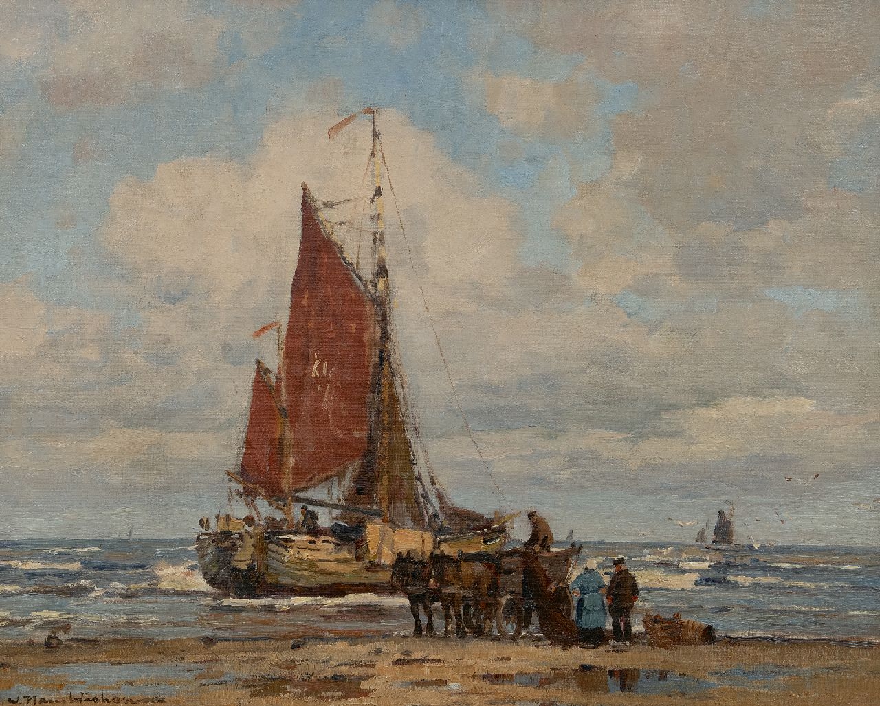 Bomschiffe, die Fischversteigerung auf dem Strand und das Meer bei Katwijk sind einige der geliebten Gegenstände des Malers Wihelm Hambüchen. Im Sog vieler anderer deutschen Künstler zog er kurz nach 1900 zum ersten Mal nach diesem geliebten holländischen Küstenort um dort das malerische Fischerleben zu malen. Er kehrte da wohlgemerkt 50 Jahre lang jeden Sommer immer wieder zurück. Unermüdet, und mit breiten, flotten Pinselstrichen malte er die charakteristischen Fischerboote, das flache Strand unter immer wechselndem bewölktem Himmel, und die lebhaften Gruppen mit Figuren zusammen nach dem Einlaufen der Boote.