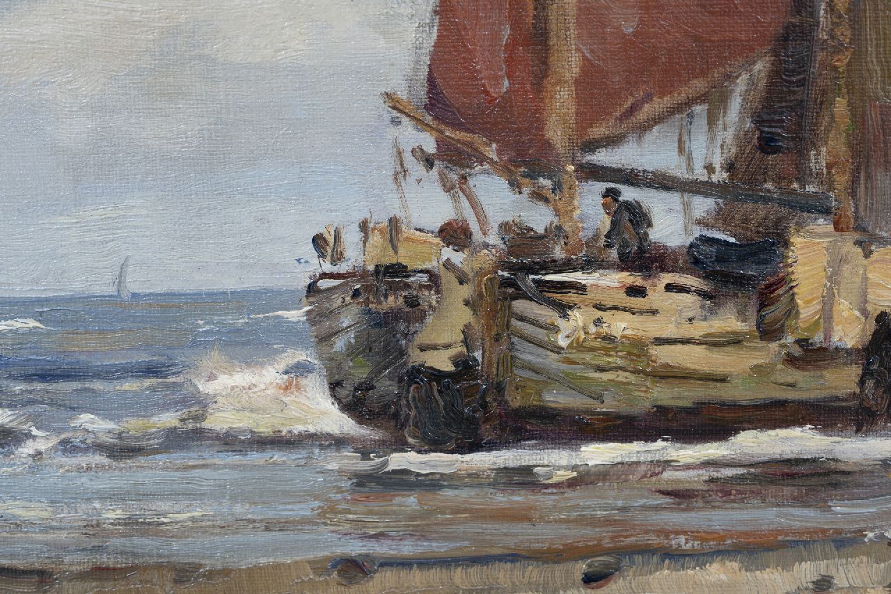 Wilhem Hambüchen Kunstwerk • Gemälde • zuvor zu verkaufen Bomschiff in der Brandung bei Katwijk