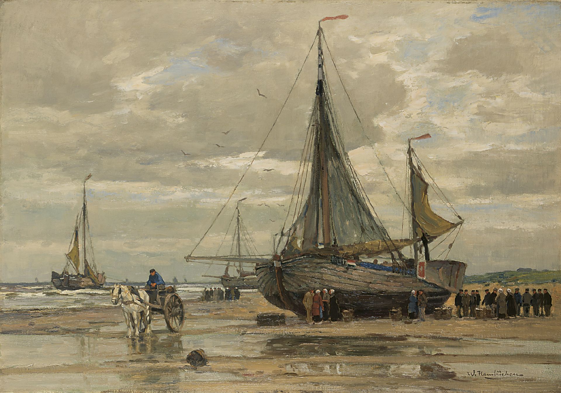 Bomschiffe, die Fischversteigerung auf dem Strand und das Meer bei Katwijk sind einige der geliebten Gegenstände des Malers Wihelm Hambüchen. Im Sog vieler anderer deutschen Künstler zog er kurz nach 1900 zum ersten Mal nach diesem geliebten holländischen Küstenort um dort das malerische Fischerleben zu malen. Er kehrte da wohlgemerkt 50 Jahre lang jeden Sommer immer wieder zurück. Unermüdet, und mit breiten, flotten Pinselstrichen malte er die charakteristischen Fischerboote, das flache Strand unter immer wechselndem bewölktem Himmel, und die lebhaften Gruppen mit Figuren zusammen nach dem Einlaufen der Boote.