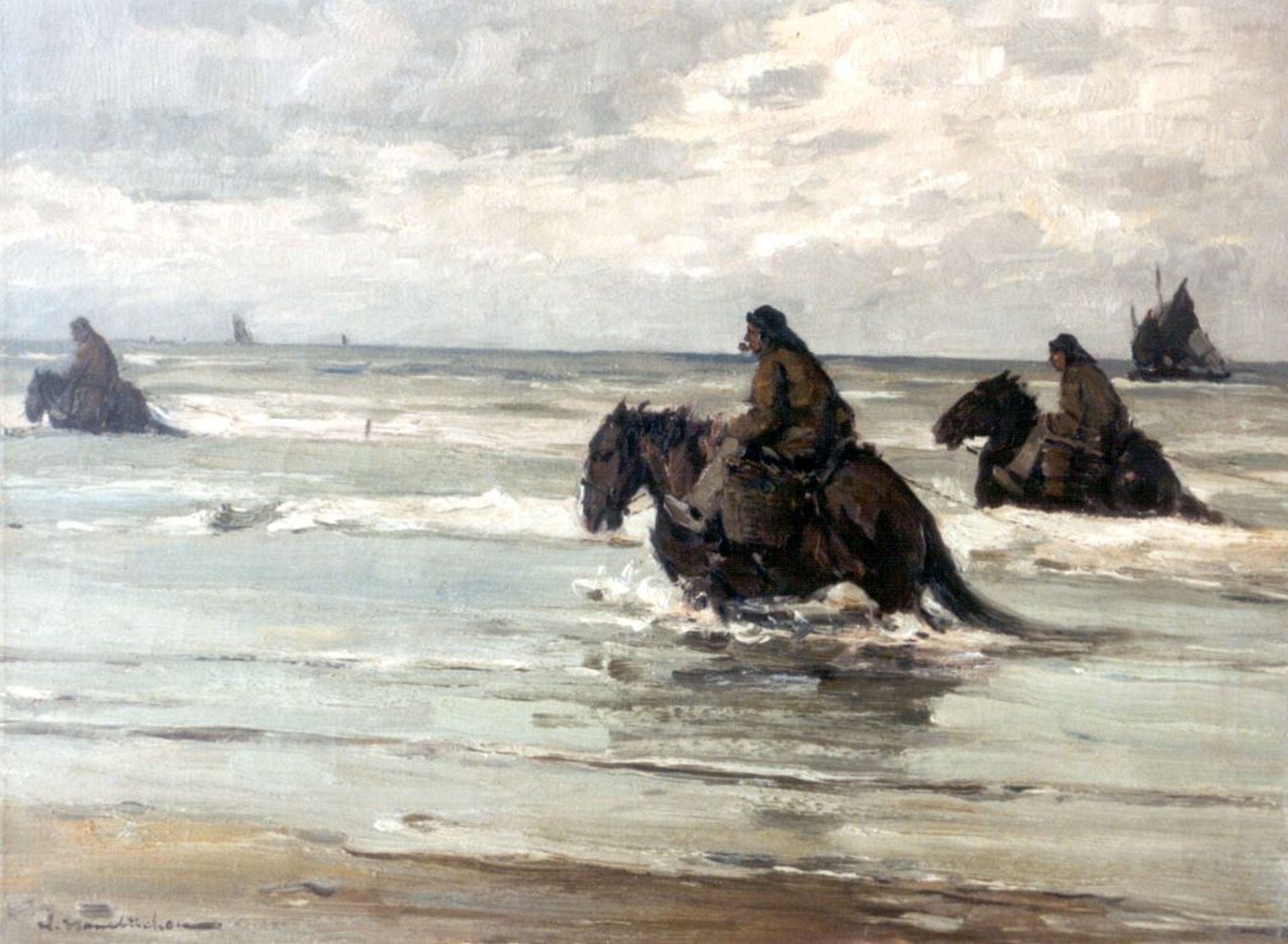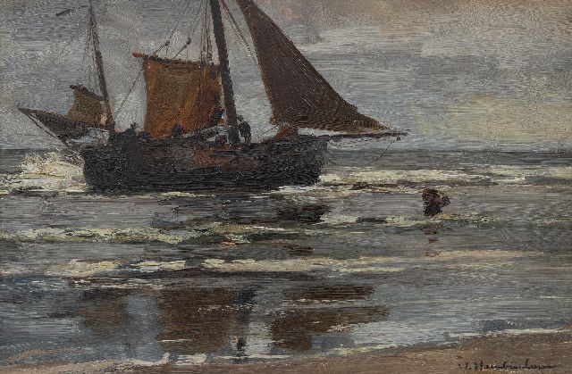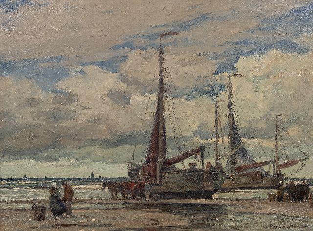 Bomschiffe, die Fischversteigerung auf dem Strand und das Meer bei Katwijk sind einige der geliebten Gegenstände des Malers Wihelm Hambüchen. Im Sog vieler anderer deutschen Künstler zog er kurz nach 1900 zum ersten Mal nach diesem geliebten holländischen Küstenort um dort das malerische Fischerleben zu malen. Er kehrte da wohlgemerkt 50 Jahre lang jeden Sommer immer wieder zurück. Unermüdet, und mit breiten, flotten Pinselstrichen malte er die charakteristischen Fischerboote, das flache Strand unter immer wechselndem bewölktem Himmel, und die lebhaften Gruppen mit Figuren zusammen nach dem Einlaufen der Boote.