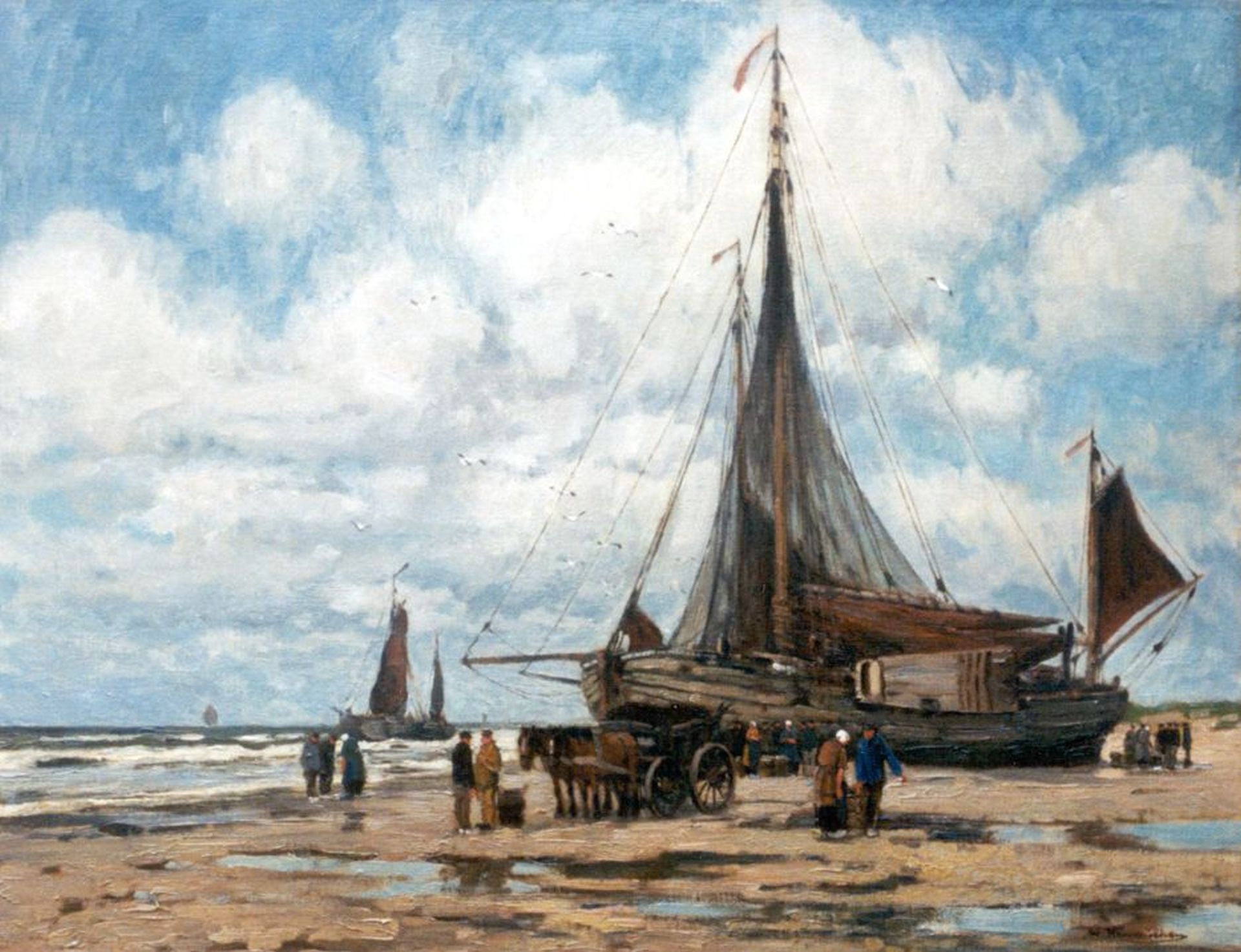 Bomschiffe, die Fischversteigerung auf dem Strand und das Meer bei Katwijk sind einige der geliebten Gegenstände des Malers Wihelm Hambüchen. Im Sog vieler anderer deutschen Künstler zog er kurz nach 1900 zum ersten Mal nach diesem geliebten holländischen Küstenort um dort das malerische Fischerleben zu malen. Er kehrte da wohlgemerkt 50 Jahre lang jeden Sommer immer wieder zurück. Unermüdet, und mit breiten, flotten Pinselstrichen malte er die charakteristischen Fischerboote, das flache Strand unter immer wechselndem bewölktem Himmel, und die lebhaften Gruppen mit Figuren zusammen nach dem Einlaufen der Boote.