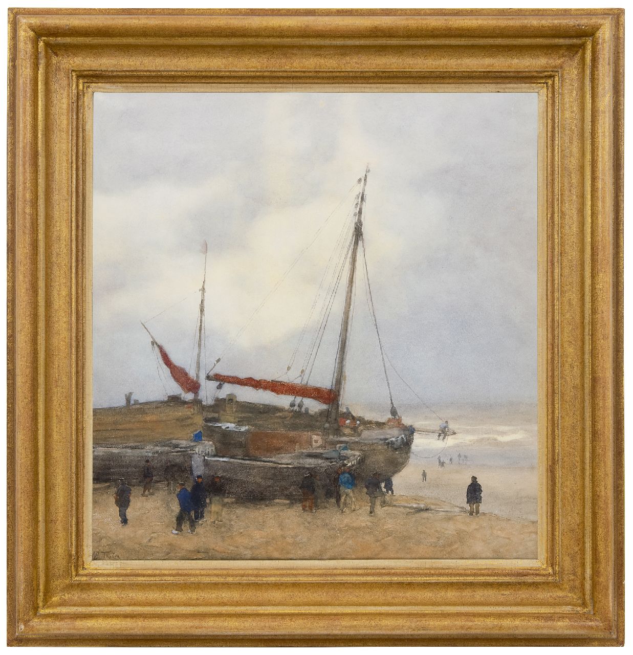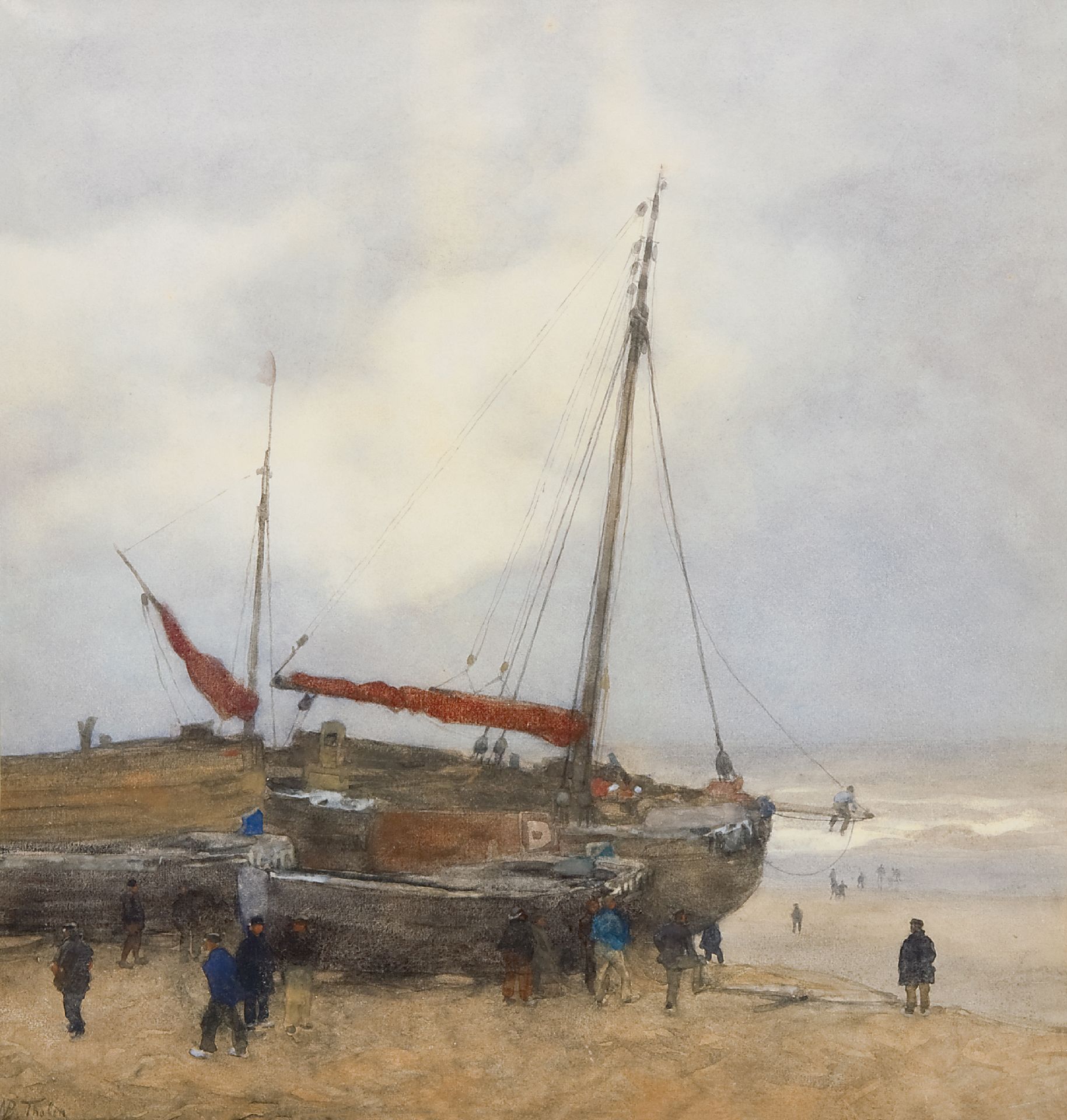 Willem Bastiaan Tholen Kunstwerk • Aquarell • Zeichnung • zu verkaufen Fischerboote am Strand von Scheveningen