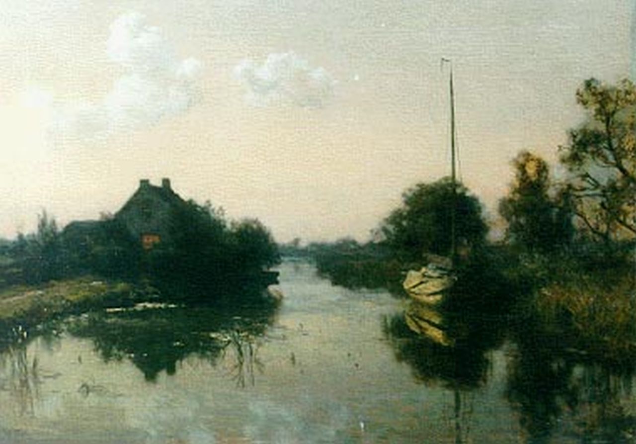 Willem Bastiaan Tholen Kunstwerk • Gemälde • zuvor zu verkaufen Evening twilight with a moored boat, the 'Eudia'