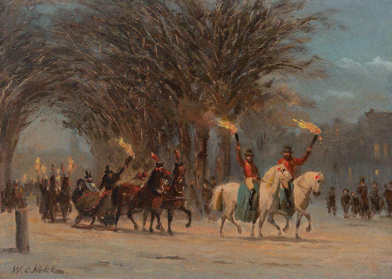 Willem Carel Nakken ist bekannt für seine sonnenverwöhnten Landschaften und Gehöfte, die oft mit Pferden gepolstert sind. Zunächst arbeitete er in und um Den Haag, Oosterbeek und in Limburg. Nach 1867 versorgten ihn häufige Studienreisen in die Normandie auch mit Material für seine Gemälde. Die schönen, schwer gebauten Pferde, die er malte, brachten ihm einen Ruf als Pferdemaler ein. Nakken war aber auch ein sehr begabter Maler von Hunden und Kühen.
