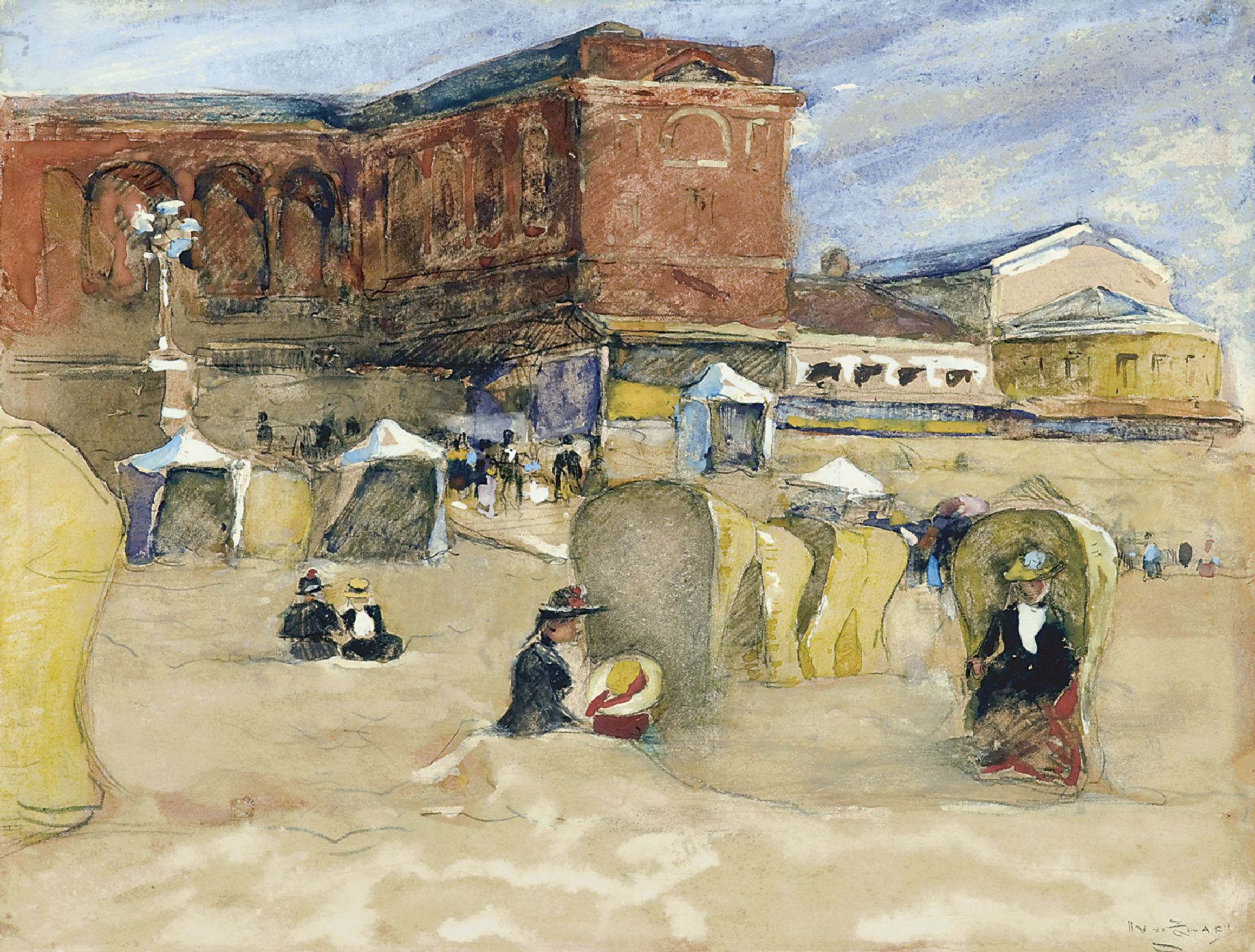 Zwart W.H.P.J. de | Wilhelmus Hendrikus Petrus Johannes 'Willem' de Zwart | Aquarelle und Zeichnungen zum Verkauf angeboten | Der Strand von Scheveningen mit rechts das Palais de Danse, Schwarze Kreide und Aquarell auf Papier 24,6 x 32,3 cm, Unterzeichnet u.r.