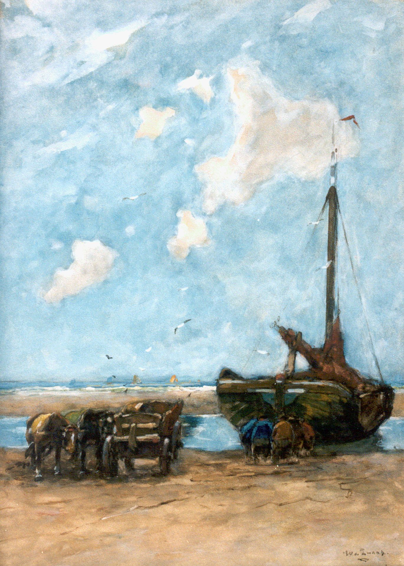 Zwart W.H.P.J. de | Wilhelmus Hendrikus Petrus Johannes 'Willem' de Zwart, Unloading the catch, Scheveningen, Aquarell auf Papier 56,5 x 40,5 cm, signed l.r.