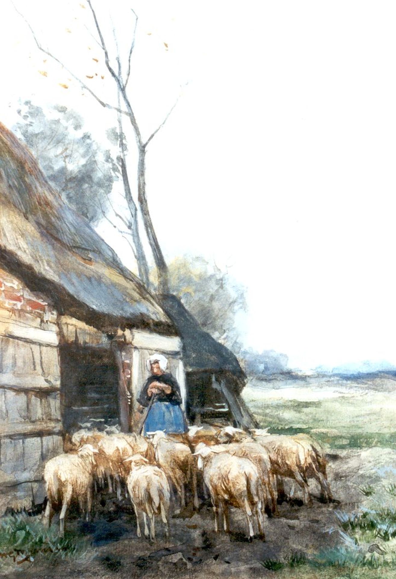 Willem George Frederik Jansen Kunstwerk • Aquarell • Zeichnung • zuvor zu verkaufen A shepherdess with her flock