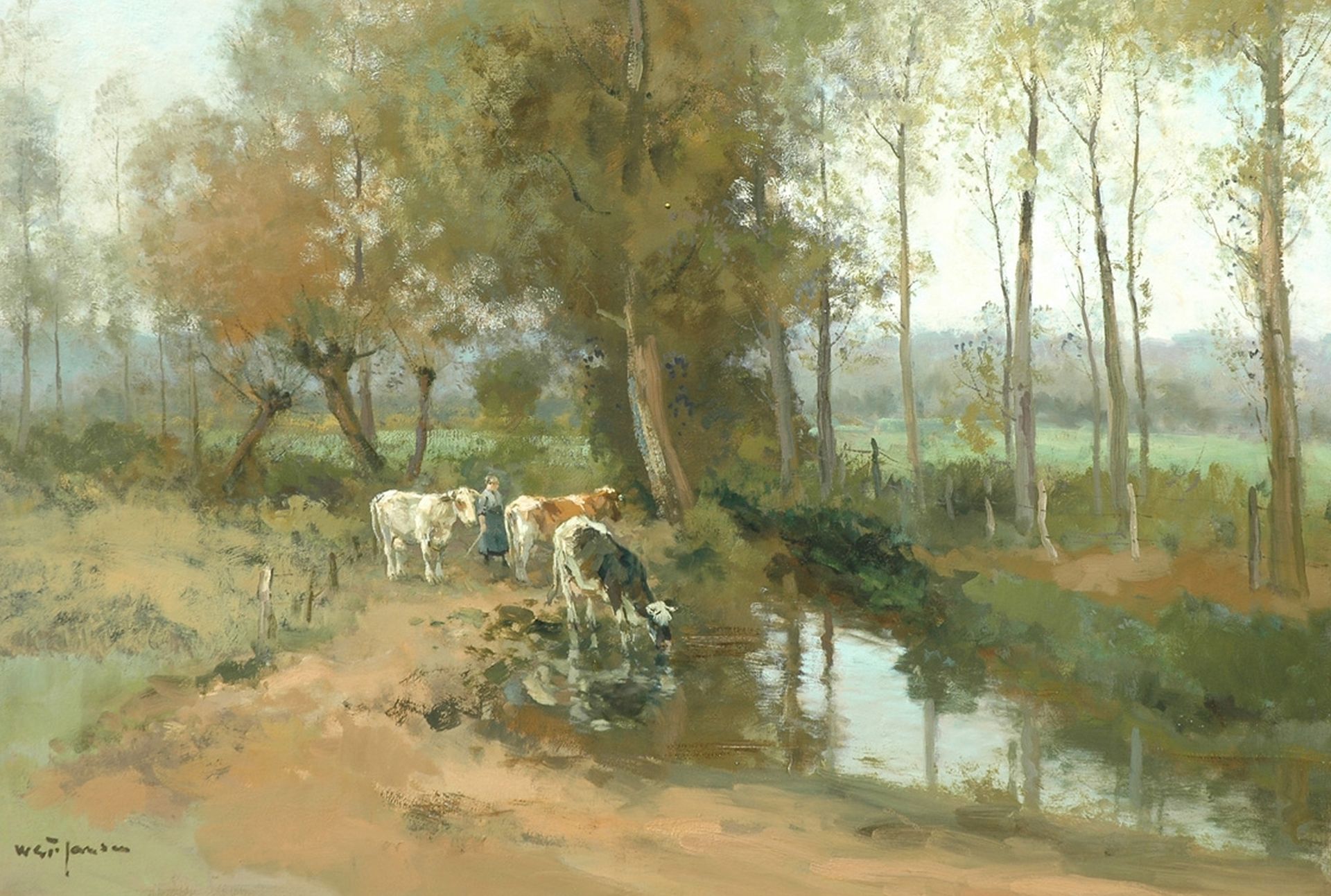 Willem George Frederik Jansen Kunstwerk • Gemälde • zuvor zu verkaufen Watering cows in a wooded landscape