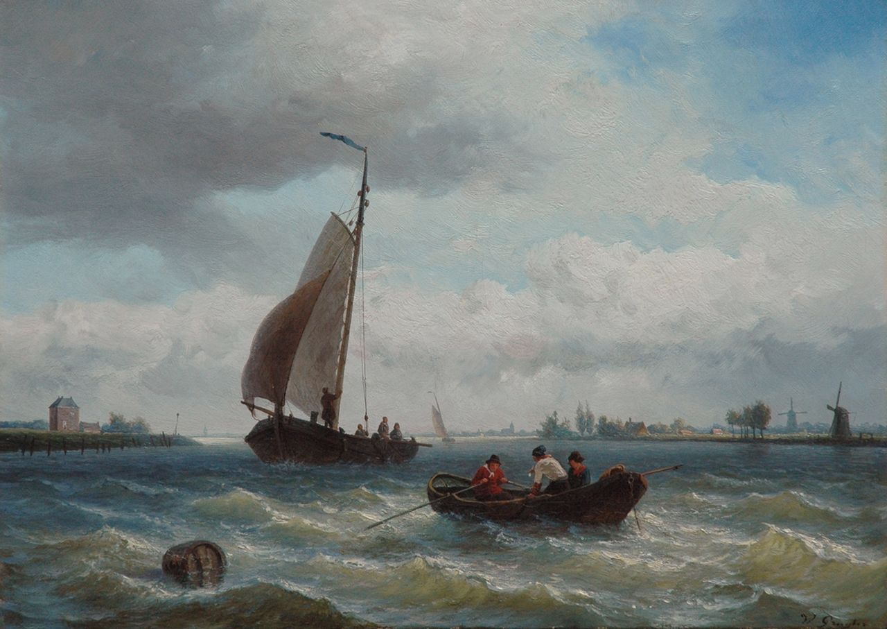 Willem Gruijter jr. Kunstwerk • Gemälde • zuvor zu verkaufen A smack and a rowing boat near a harbour entrance