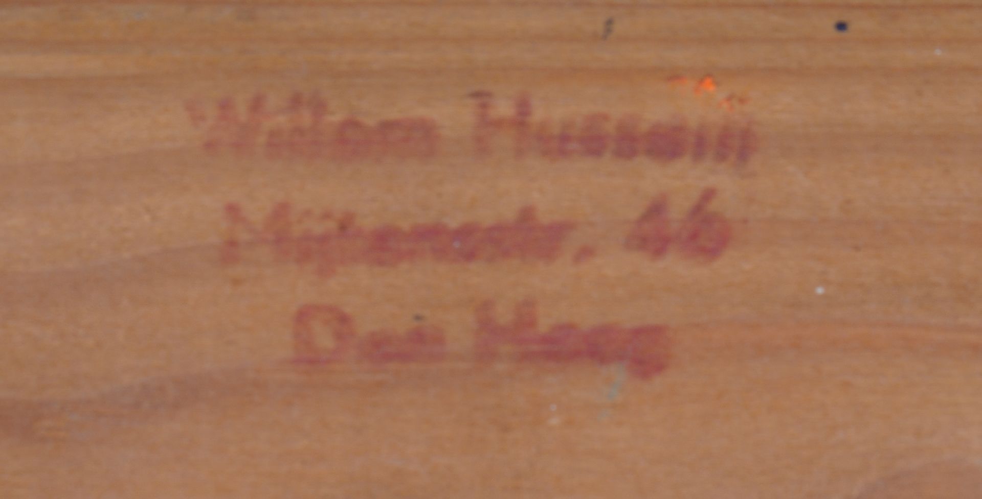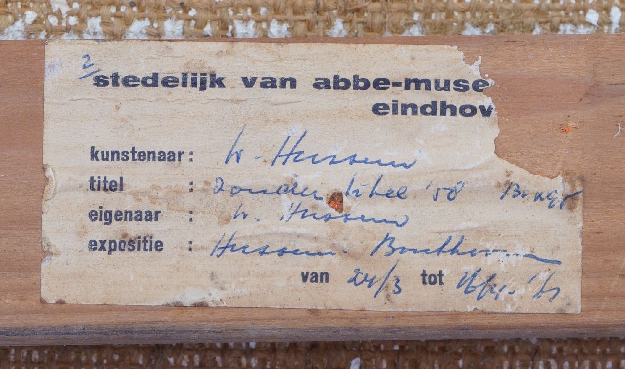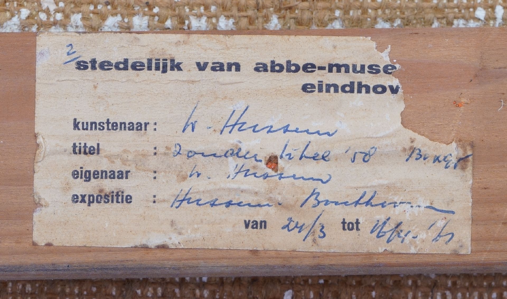 Der Haager Dichter-künstler Willem Hussem malte anfangs naturalistische Landschaften und Stilleben. Während eines Aufenthalts in Frankreich von 1933 bis zum 1936 begegnete er Picasso und machte er Bekantschaft mit ausländischer Kunst. Ab jener Zeit stand sein Werk im Zeichen der Abstraktion und des Experiments. Seit den fünfziger Jahren war Kalligraphie eine wichtige Inspirationsquelle. Dies führte anfangs zu allerhand freien, expressiven Formen und nachher, in den sechziger Jahren, zu ausgewogenen Kompositionen von Linien, Farben und Formen auf einem monochromen Untergrund. Hussem war Mitglied und Mittelpunkt der Haagse Posthoorn Groep. Im Jahre 1949 trat er der Gruppe Vrij Beelden bei und wurde 1960 Mitglied der Haager Malergruppe Fugare, deren Mitglieder sich gegen die 'Zufälligkeit' des abstrakten Expressionismus von unter anderem der Cobra-Groep kehrten. Künstlerisch betrachtet erlebte Hussem seine fruchtbarsten Jahre am Ende der fünfziger und sechziger Jahre.