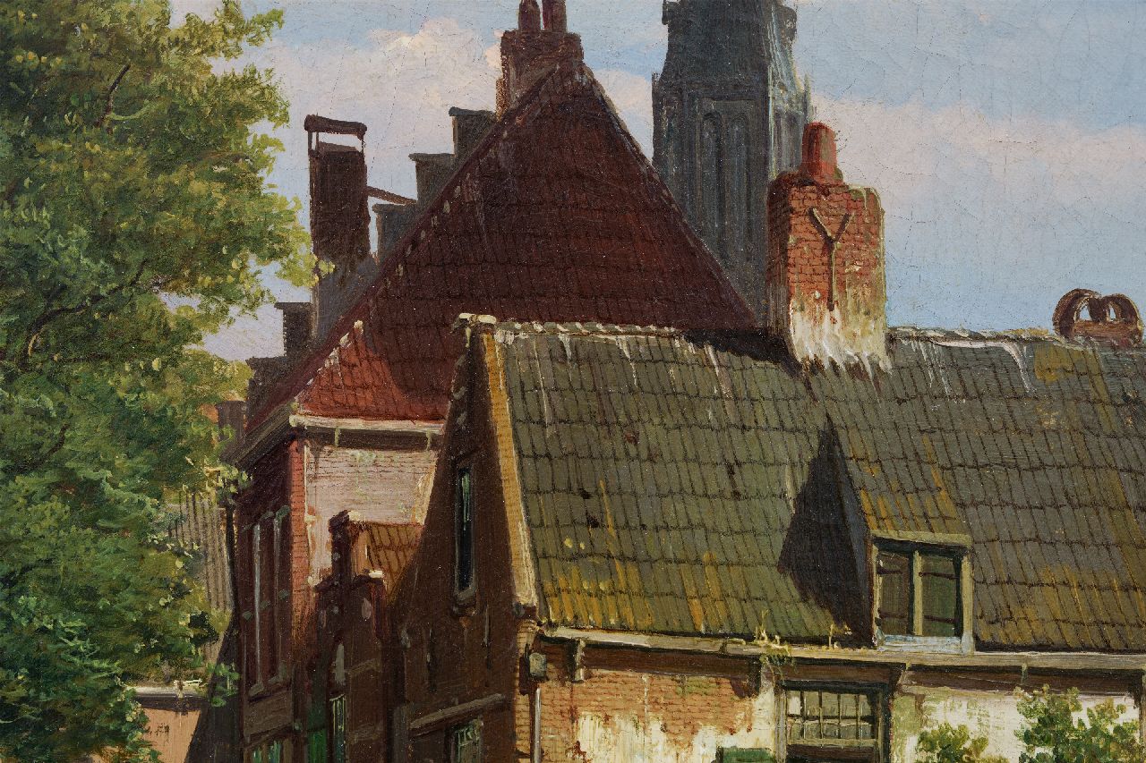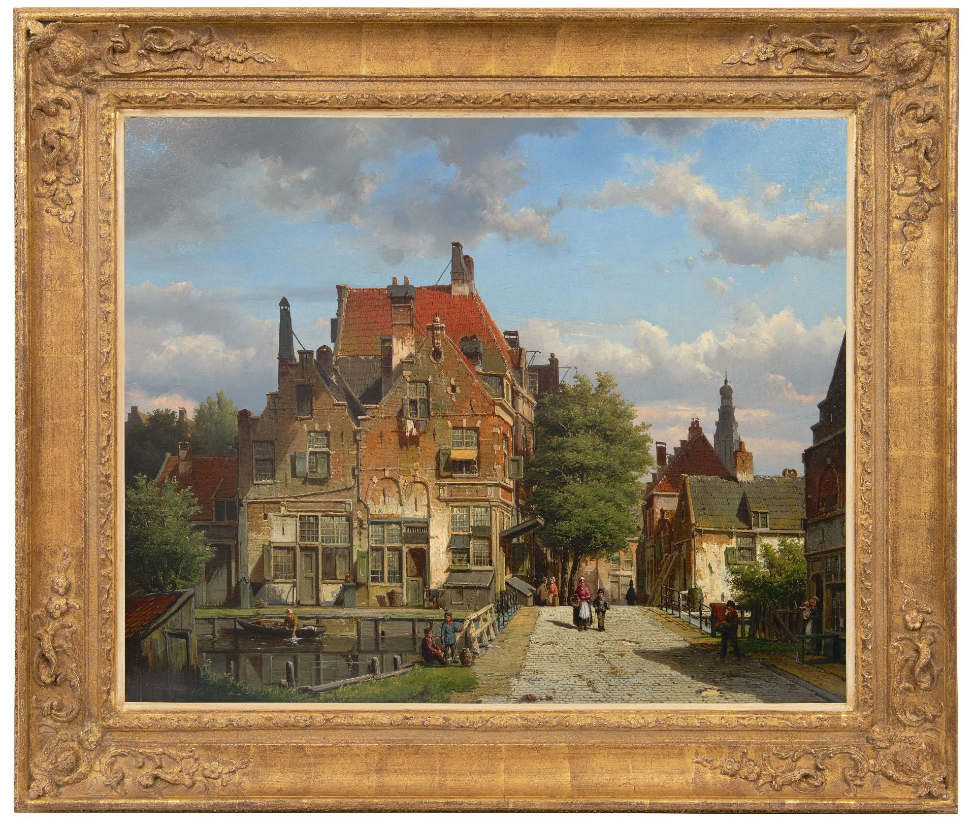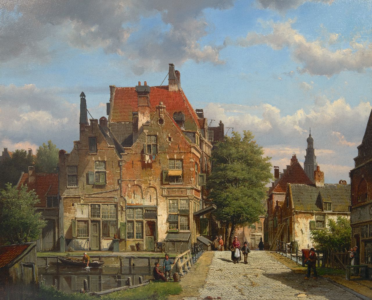 Willem Koekkoek Kunstwerk • Gemälde • zuvor zu verkaufen Holländisches Stadtbild mit einer Brücke über einen Kanal