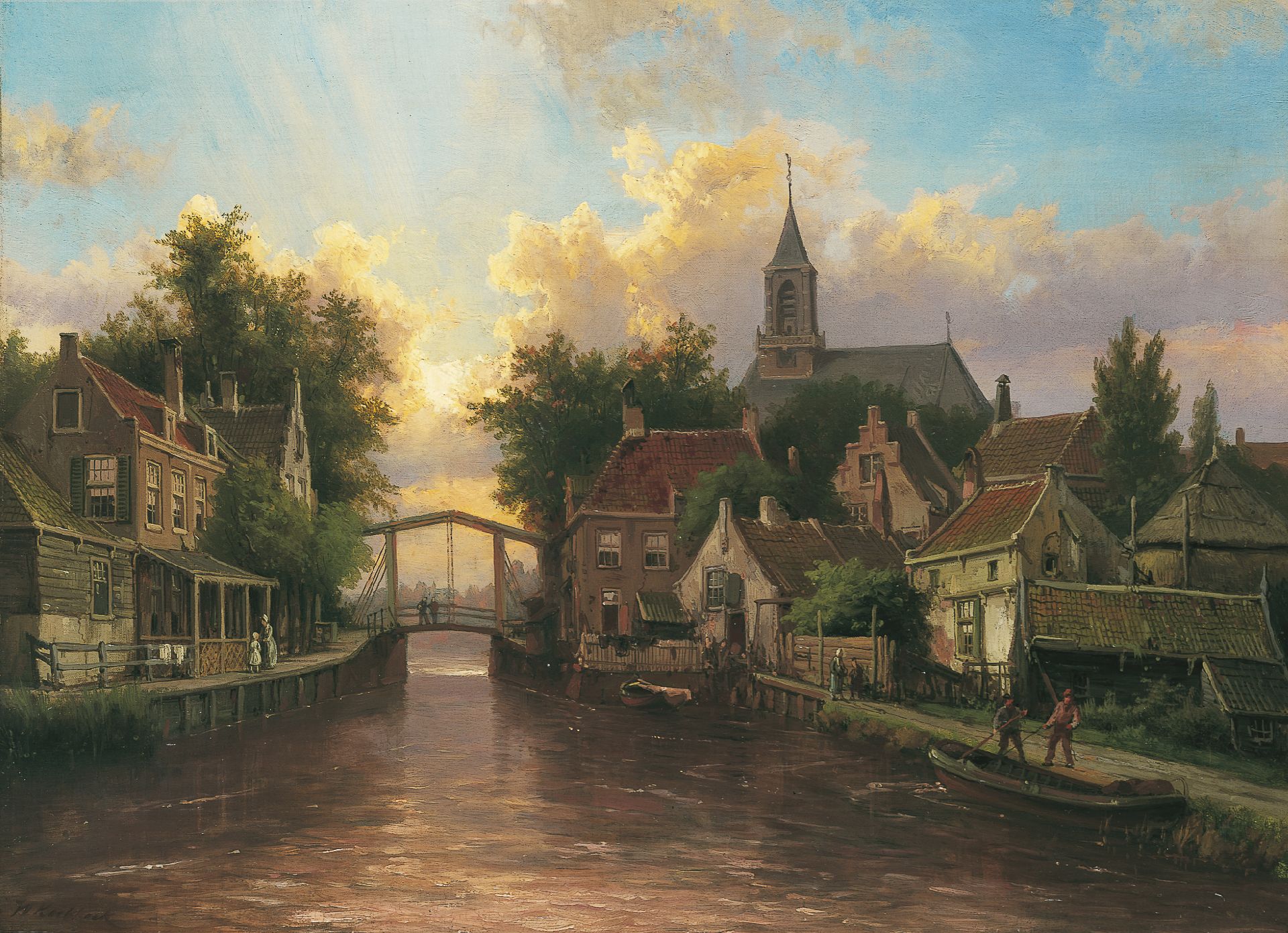 Willem Koekkoek Kunstwerk • Gemälde • zuvor zu verkaufen A view of a canal in a Dutch town