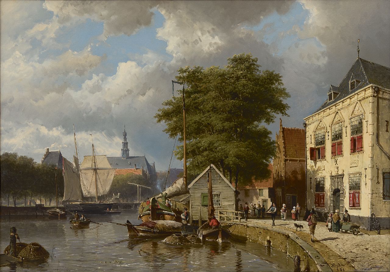 Willem Koekkoek Kunstwerk • Gemälde • zuvor zu verkaufen Stadtansicht met angelegten Schiffen