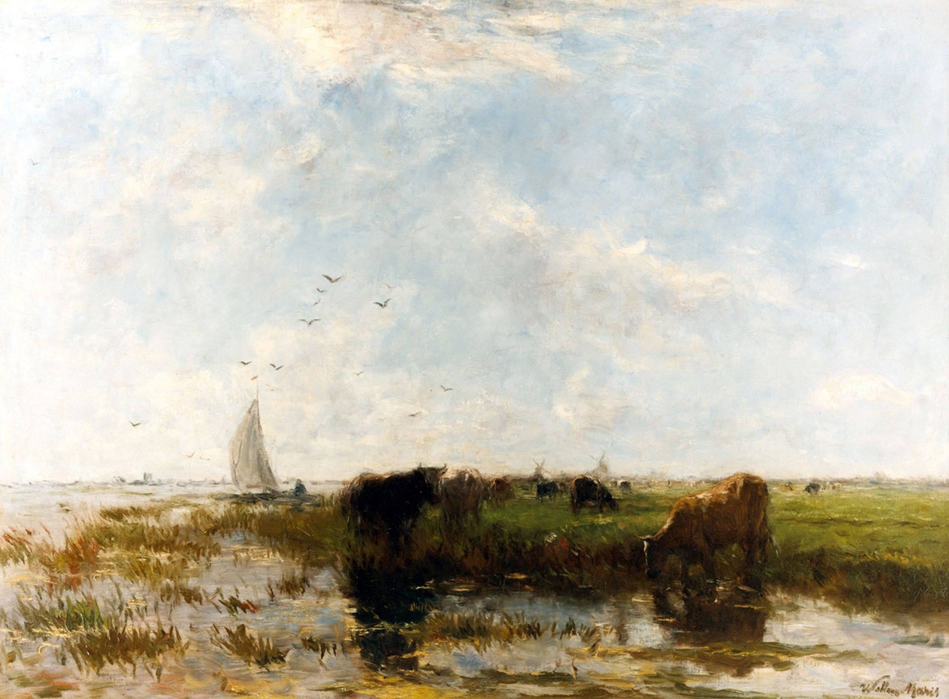 Willem Maris war der jüngere Bruder von Jacob und Matthijs Maris, mit denen er eine Werkstatt teilte im Haag. Er malte am liebsten wasserreiche Landschaften, mit Enten oder Kühen in sumpfigen Weiden an einem Kanal oder Graben. Dabei ging es Maris vor allen Dingen um die Aufzeichnung von der Art und Weise wie das Licht seine Gegenstände berührte. ‘Ich male keine Kühe, sondern die Lichtwirkung‘, sagte er einmal über sein Werk. Aus diesem Grunde wurde er mal der ‘Impressionist’ von der Haagse School genannt.