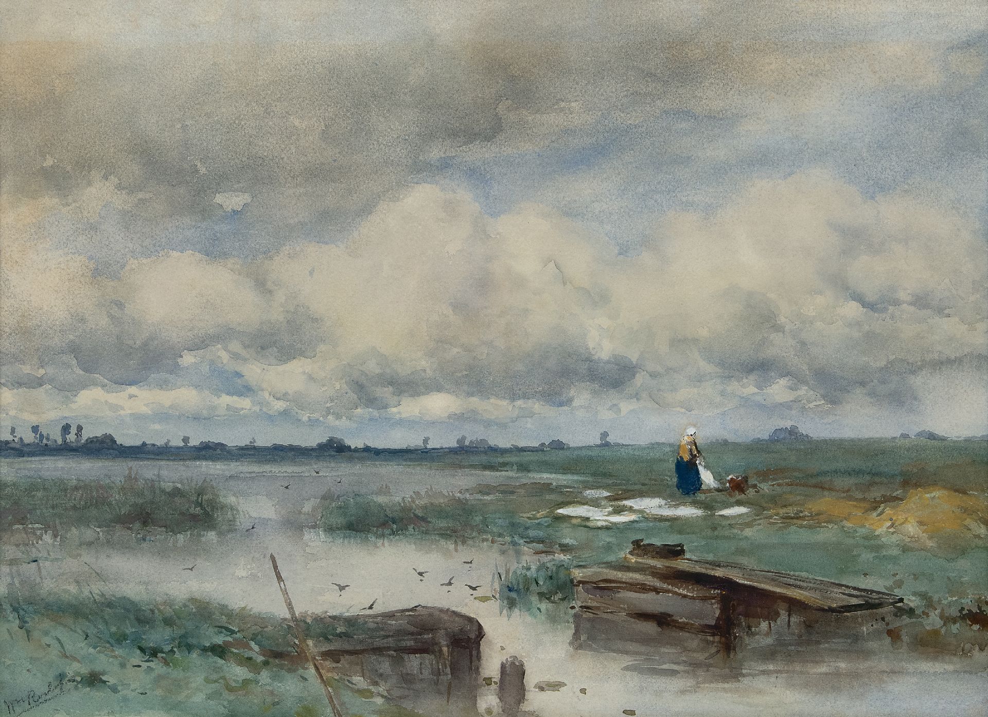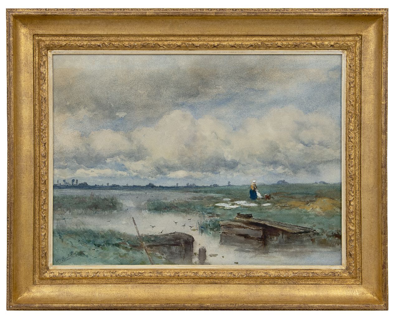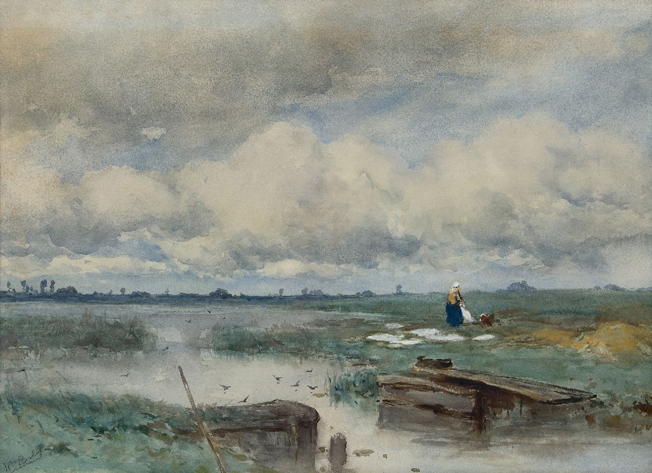 Willem Roelofs Kunstwerk • Aquarell • Zeichnung • zu verkaufen Water landscape with bleaching field