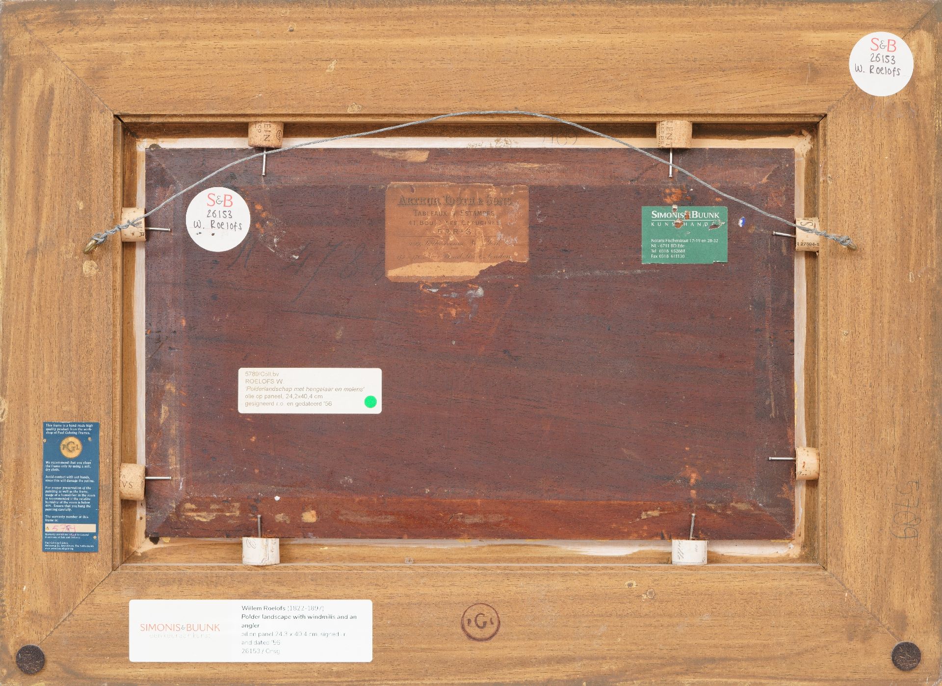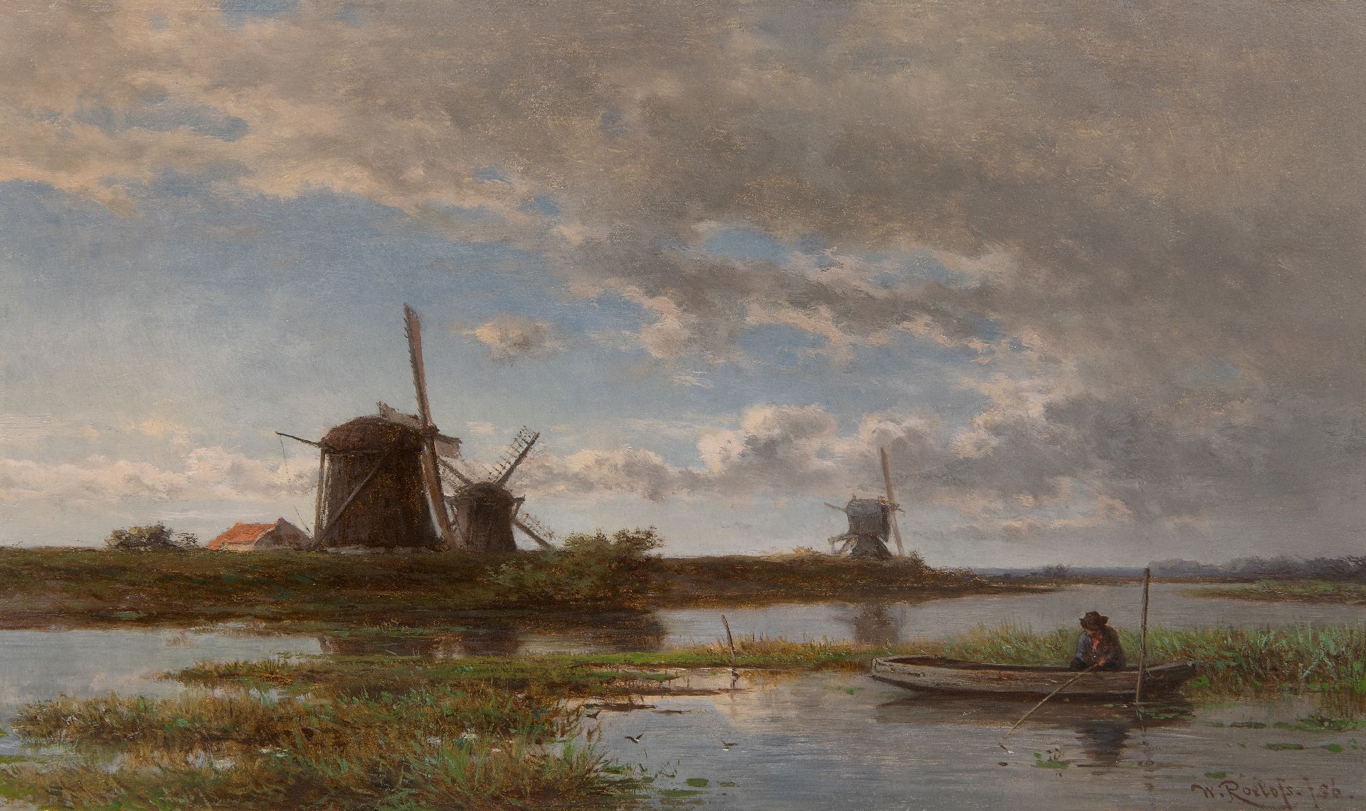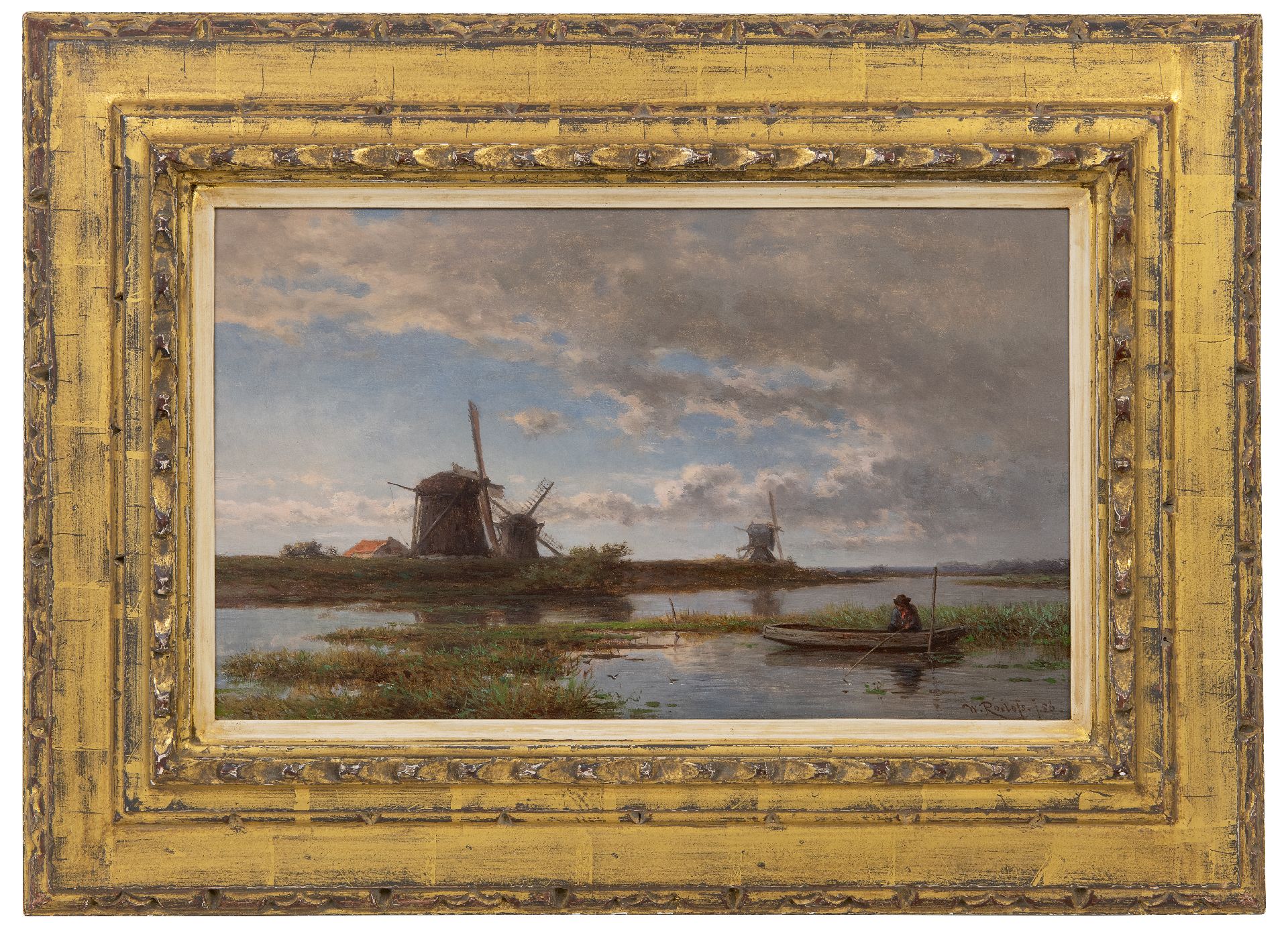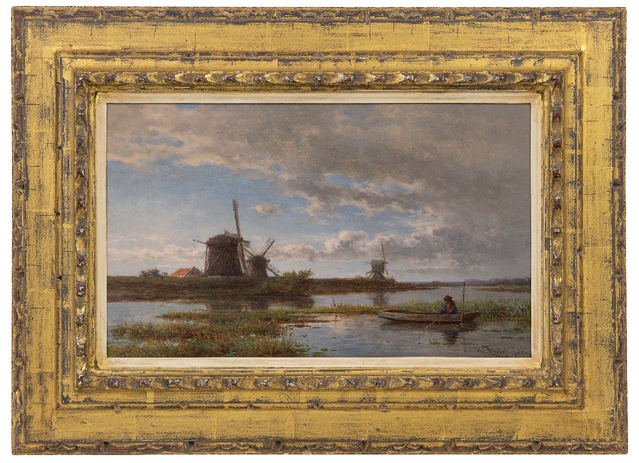 Willem Roelofs Kunstwerk • Gemälde • zu verkaufen Polderlandschaft mit Windmühlen und einem Angler