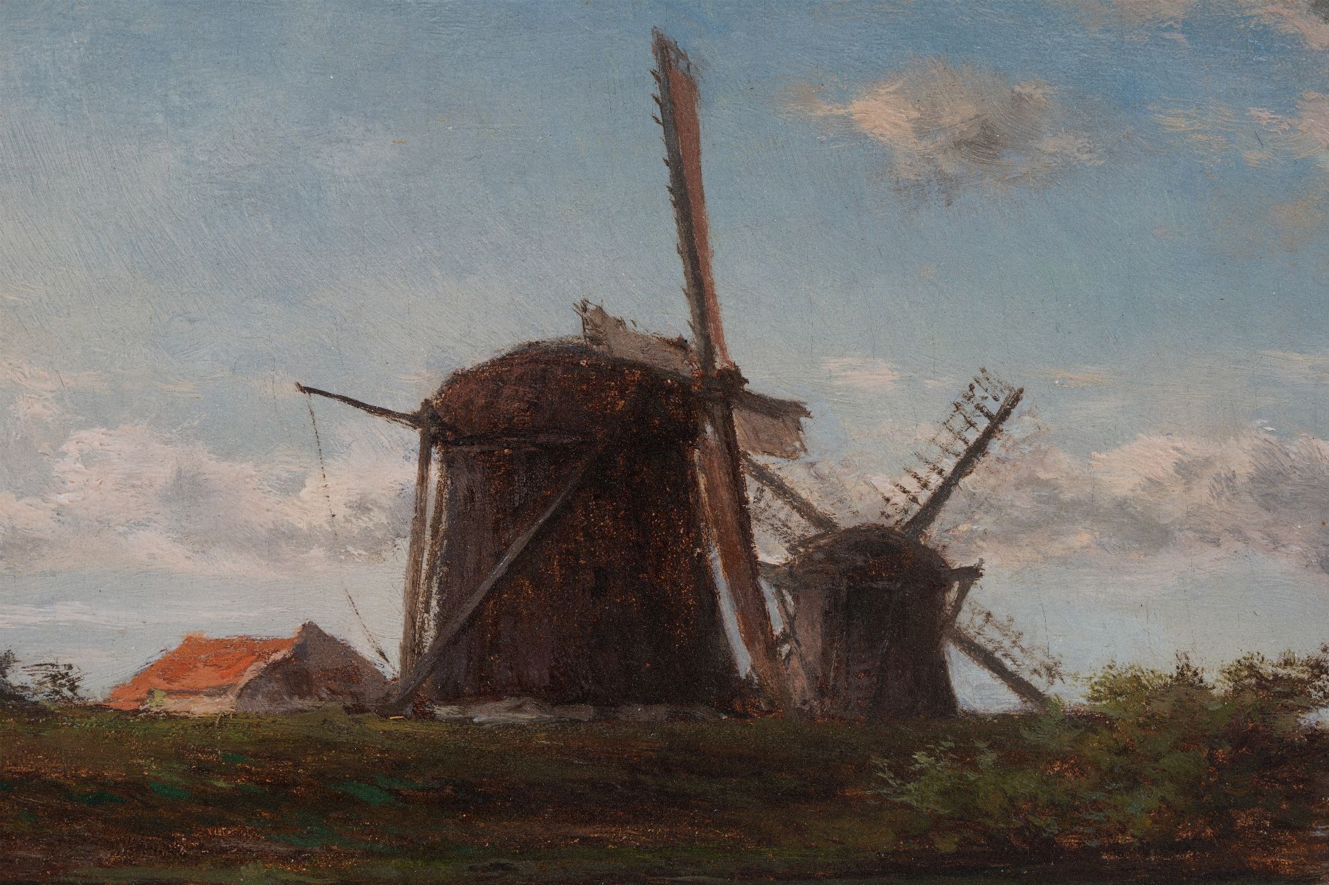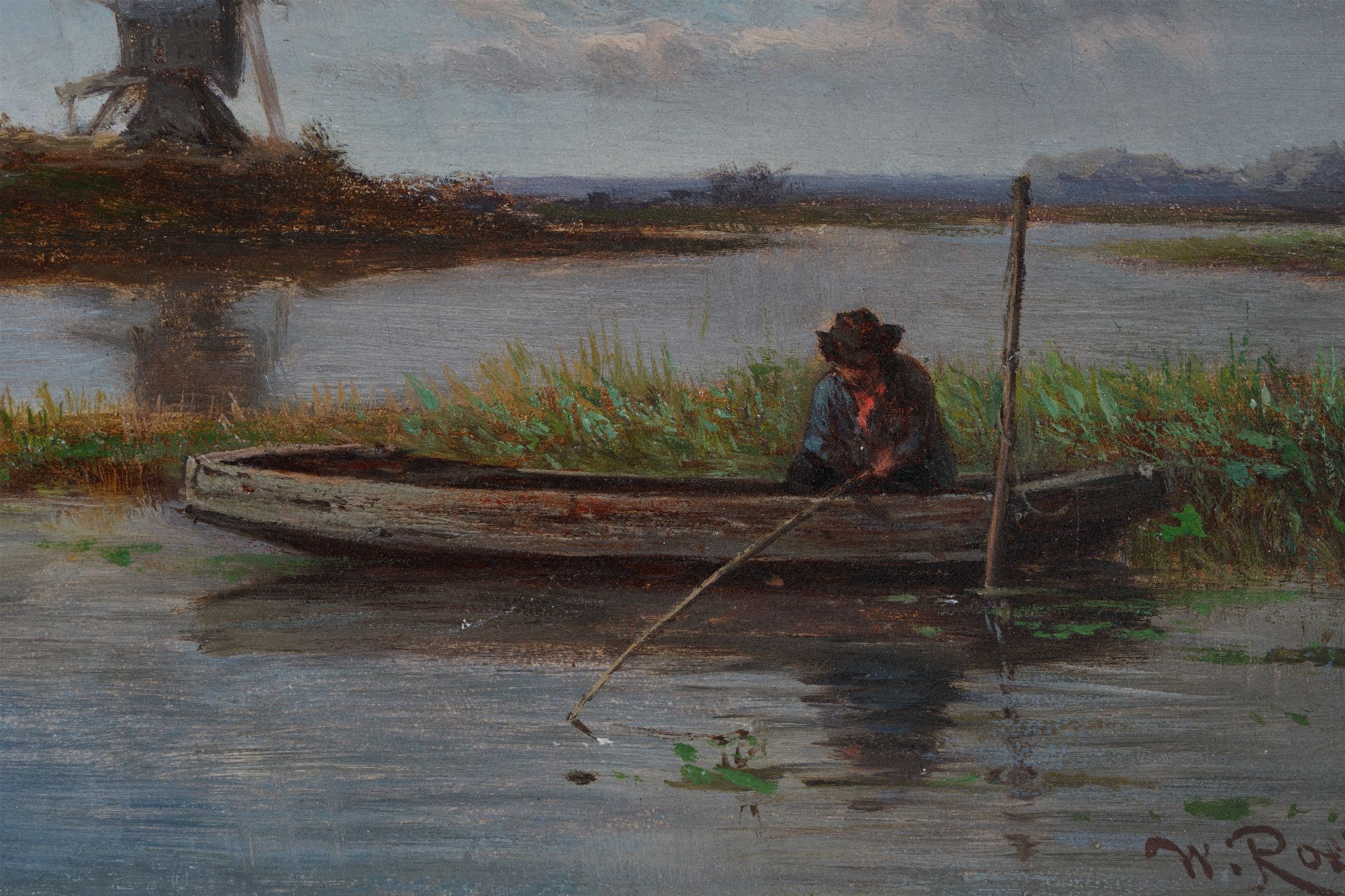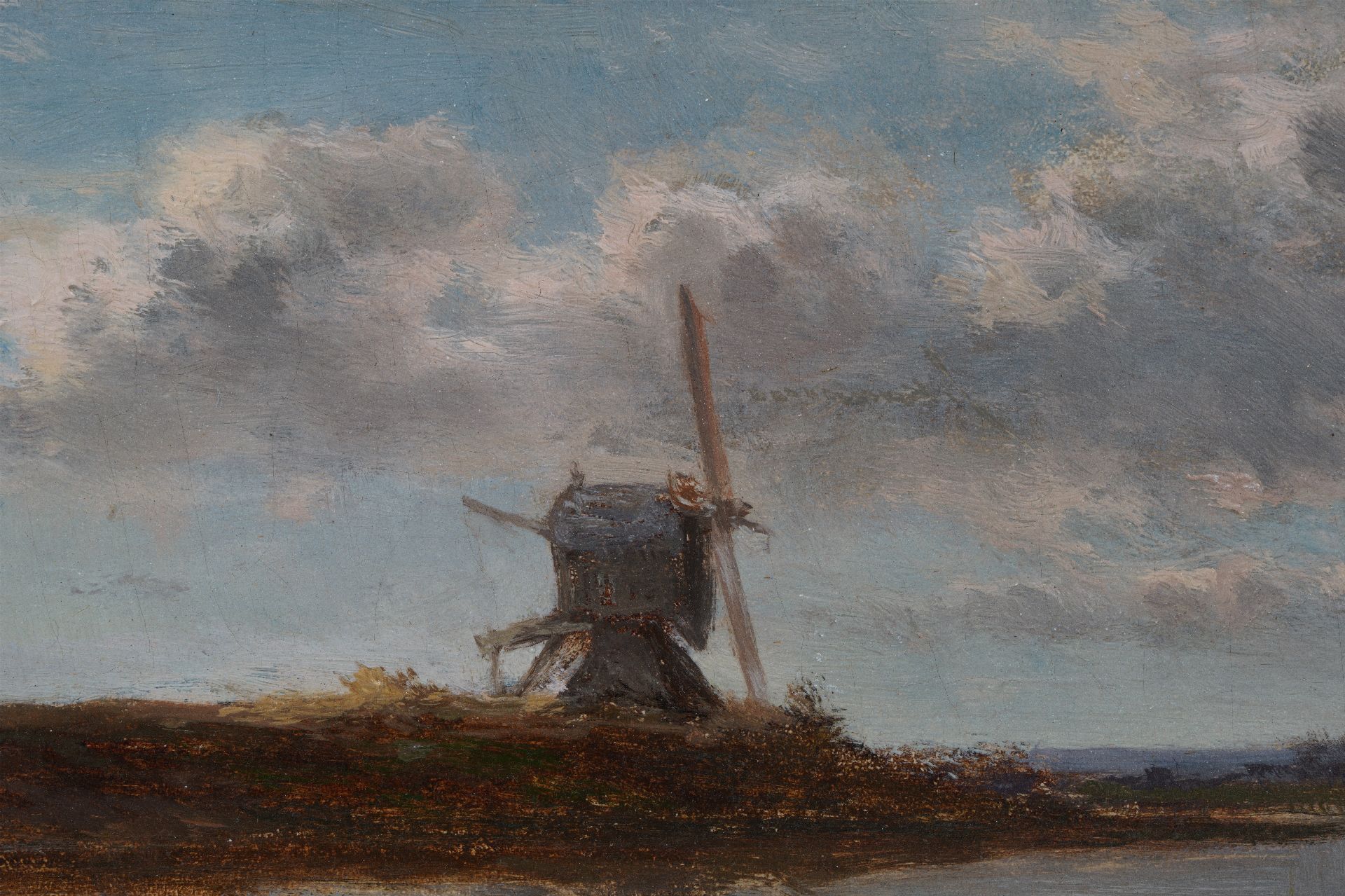 Willem Roelofs Kunstwerk • Gemälde • zu verkaufen Polderlandschaft mit Windmühlen und einem Angler