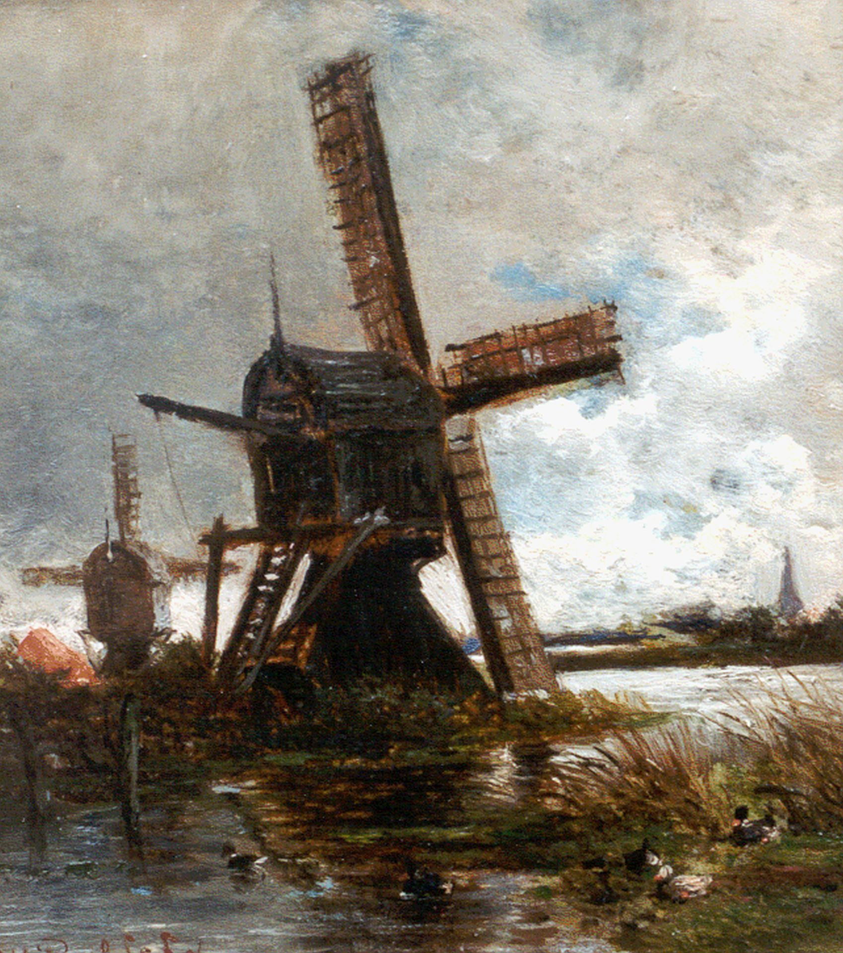 Willem Roelofs Kunstwerk • Gemälde • zuvor zu verkaufen Smockmills along a canal