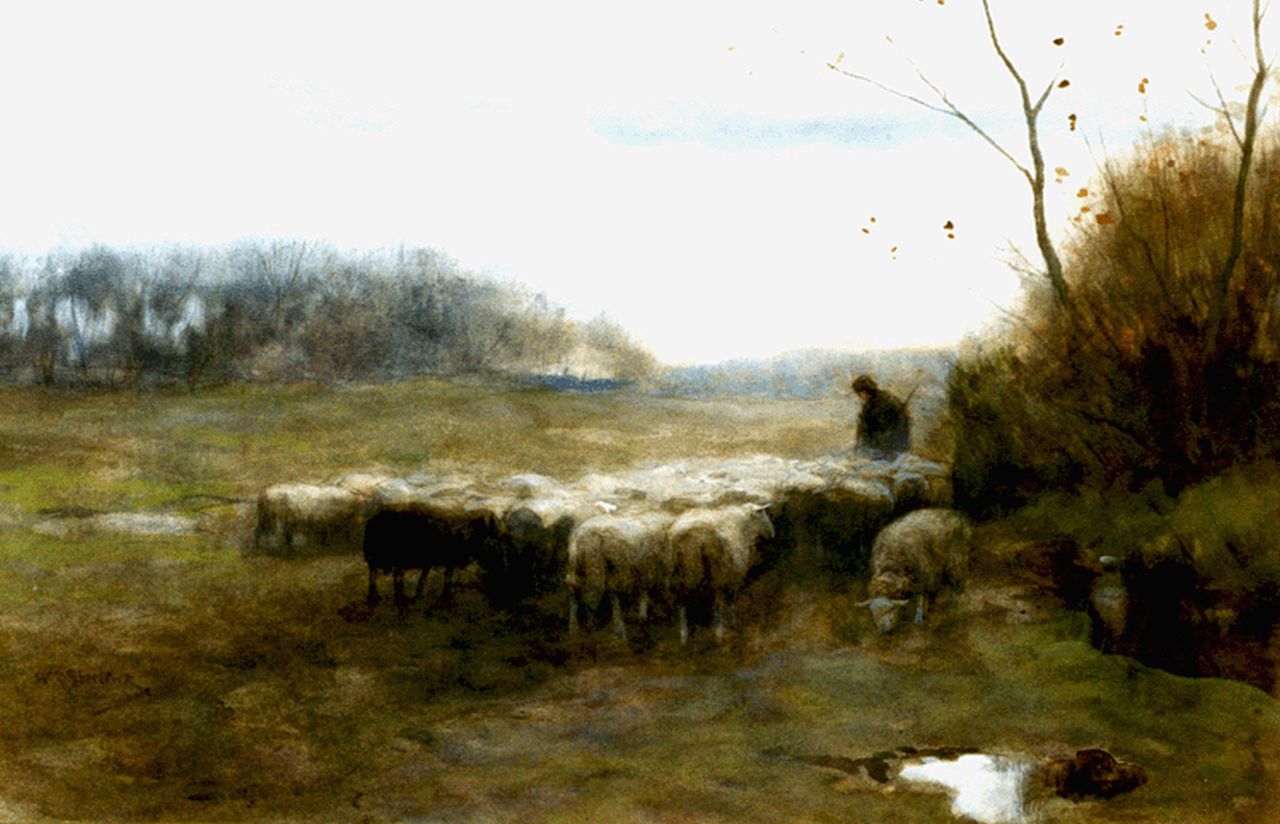 Willem Steelink jr. Kunstwerk • Aquarell • Zeichnung • zuvor zu verkaufen A shepherd and flock
