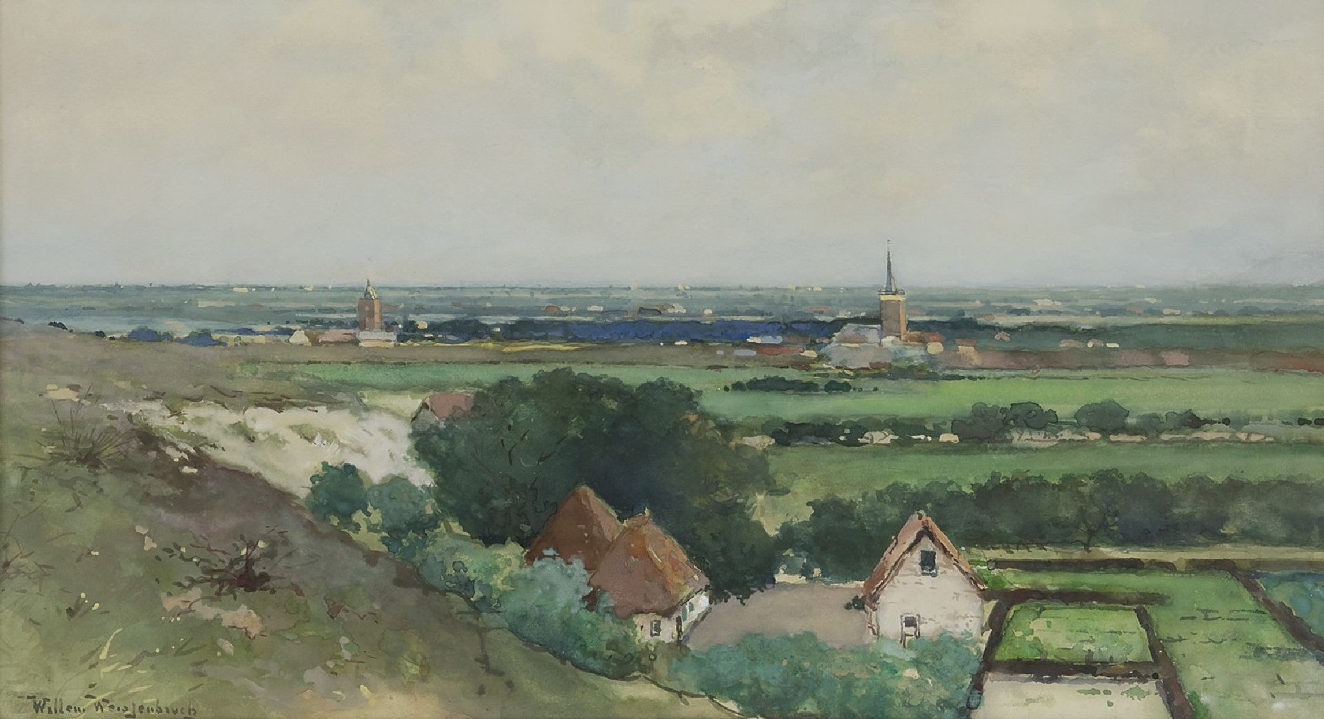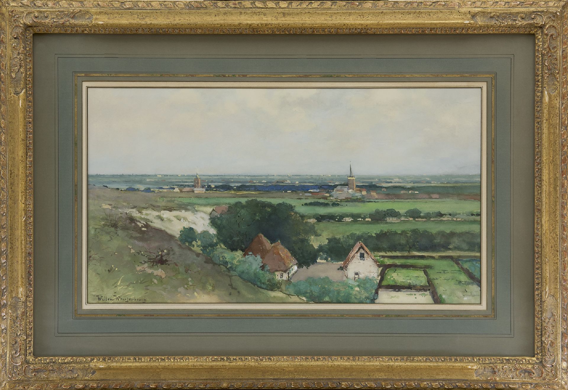 Willem Weissenbruch Kunstwerk • Aquarell • Zeichnung • zu verkaufen Ansicht auf ein Dorf ab einer Düne