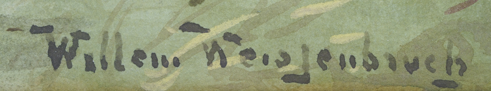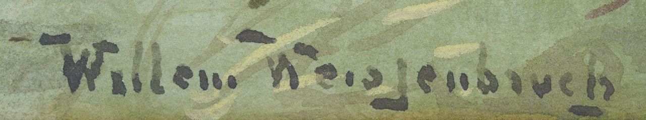 Willem Weissenbruch, Sohn und Schüler des Den Haager Schulmalers H.J. Weissenbruch folgte in Bezug auf Stil und Motivwahl den Spuren seines Vaters. Er malte Landschaften mit Wasser-, Hafen- und Strandszenen, für die er sich in und um Den Haag inspirieren ließ. Er lebte auch einige Zeit in De Kaag, Noorden, Nieuwkoop und Het Gooi. In dem für ihn charakteristischen lockeren und freien impressionistischen Stil malte er auch einige Stillleben.