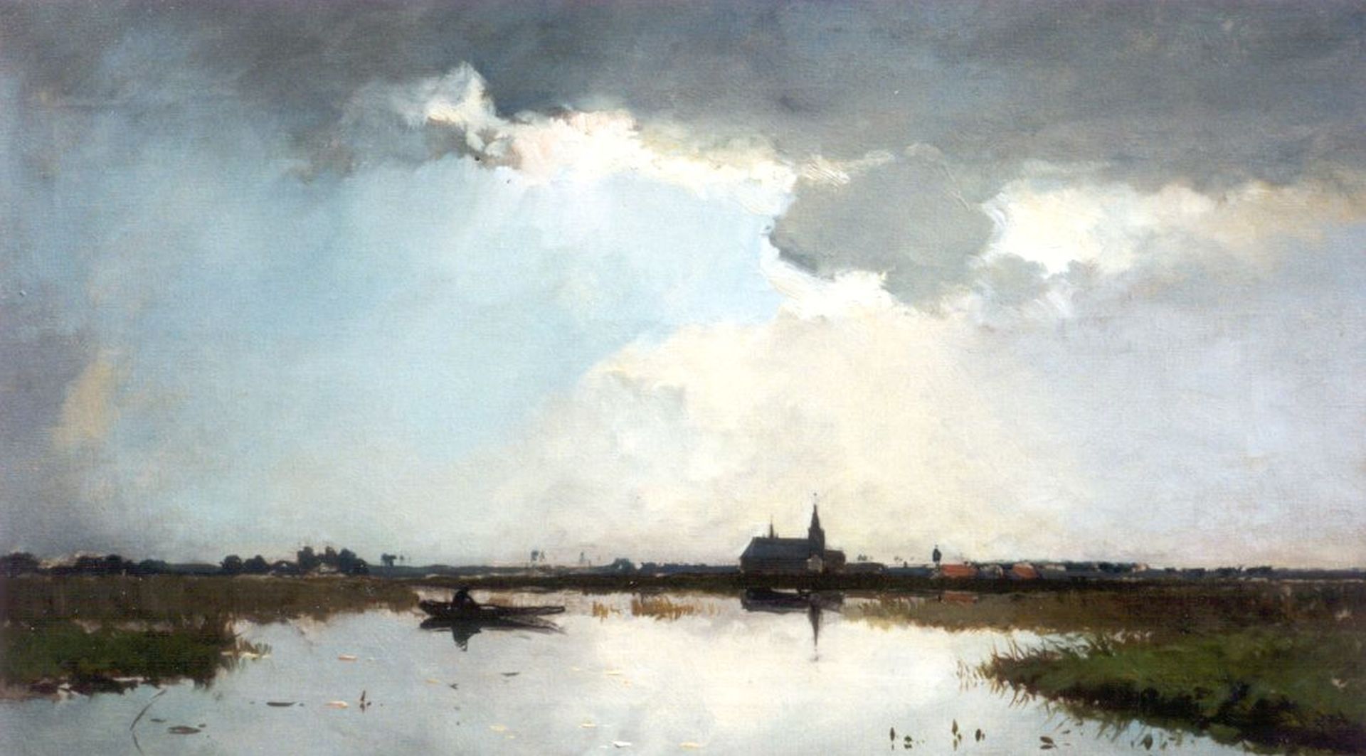 Willem Weissenbruch Kunstwerk • Gemälde • zuvor zu verkaufen River view with fisherman and a church in the distance