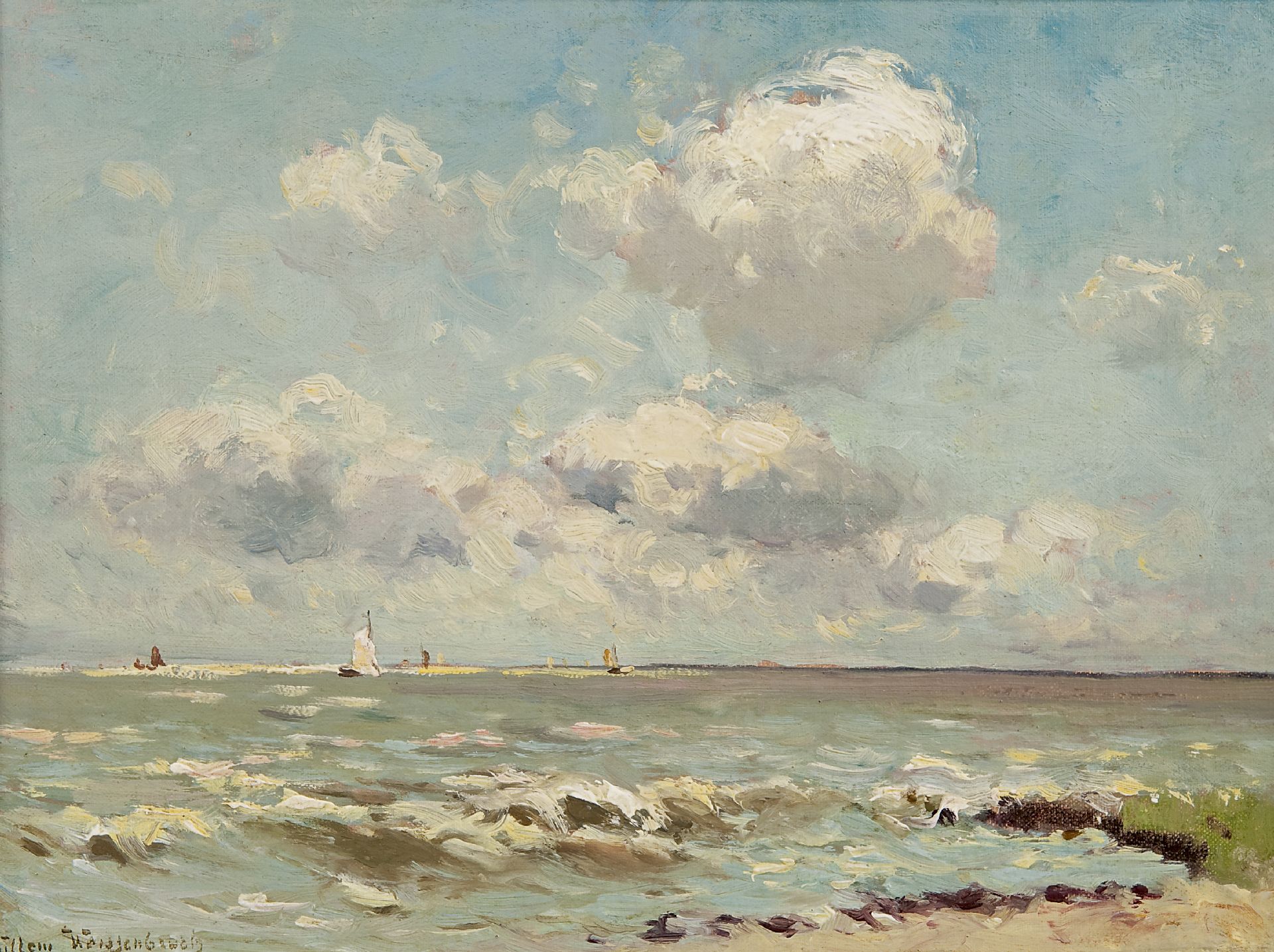 Willem Weissenbruch, Sohn und Schüler des Den Haager Schulmalers H.J. Weissenbruch folgte in Bezug auf Stil und Motivwahl den Spuren seines Vaters. Er malte Landschaften mit Wasser-, Hafen- und Strandszenen, für die er sich in und um Den Haag inspirieren ließ. Er lebte auch einige Zeit in De Kaag, Noorden, Nieuwkoop und Het Gooi. In dem für ihn charakteristischen lockeren und freien impressionistischen Stil malte er auch einige Stillleben.