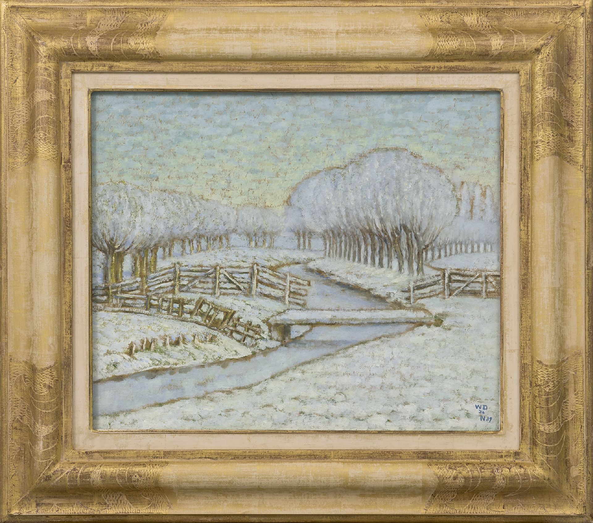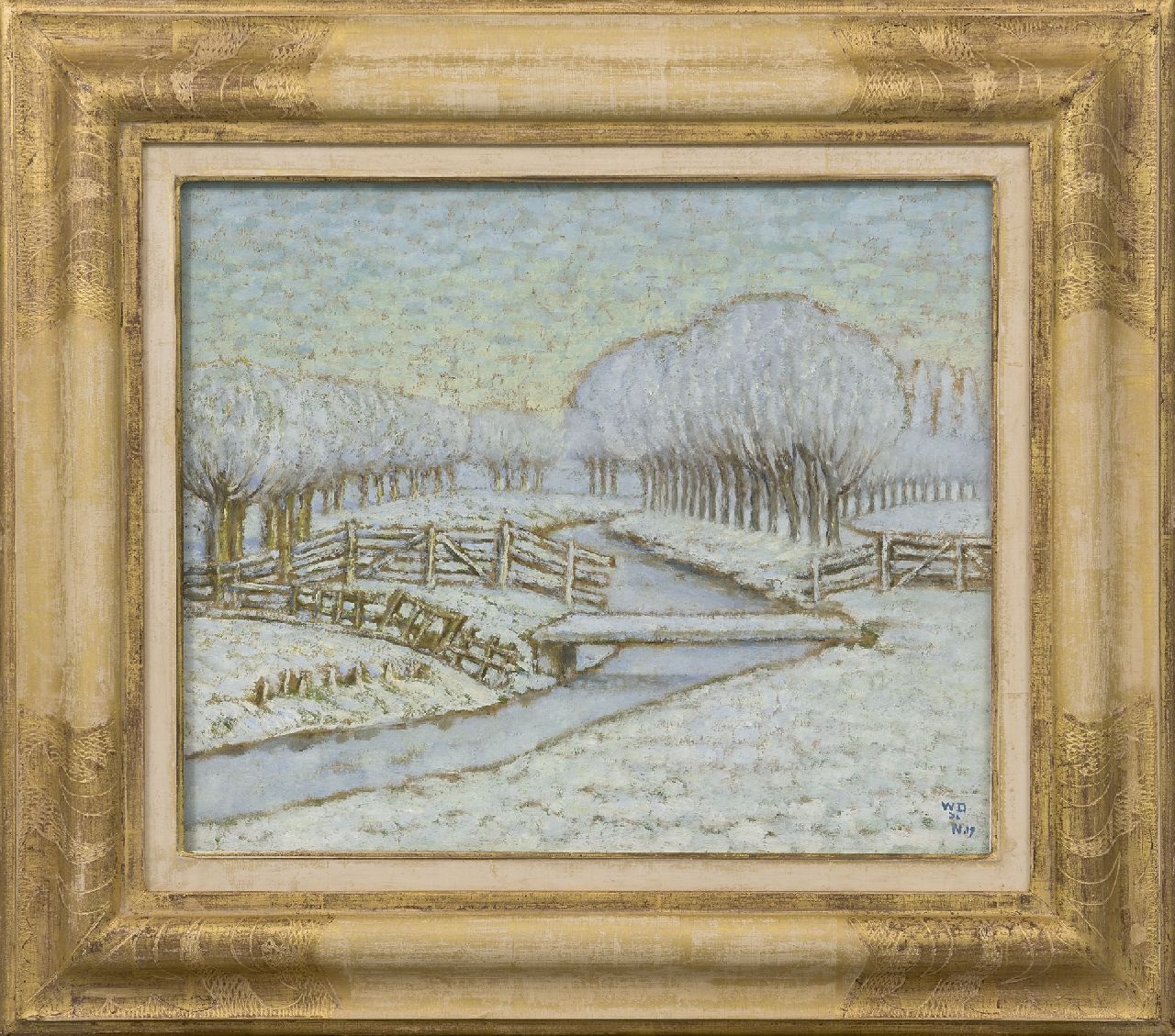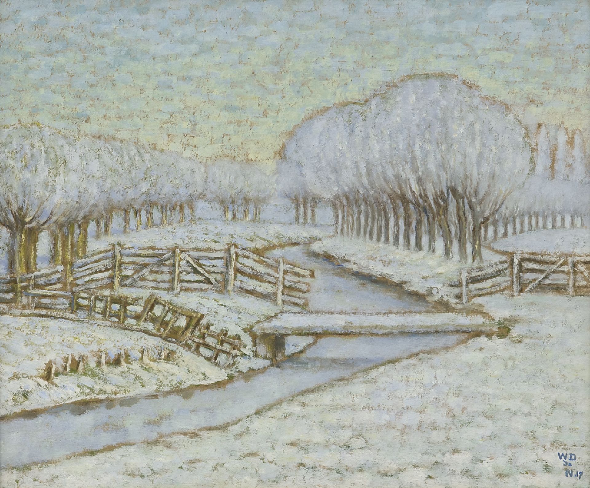 William Degouve de Nuncques Kunstwerk • Gemälde • zuvor zu verkaufen Baumreihe in holländischer Schneelandschaft