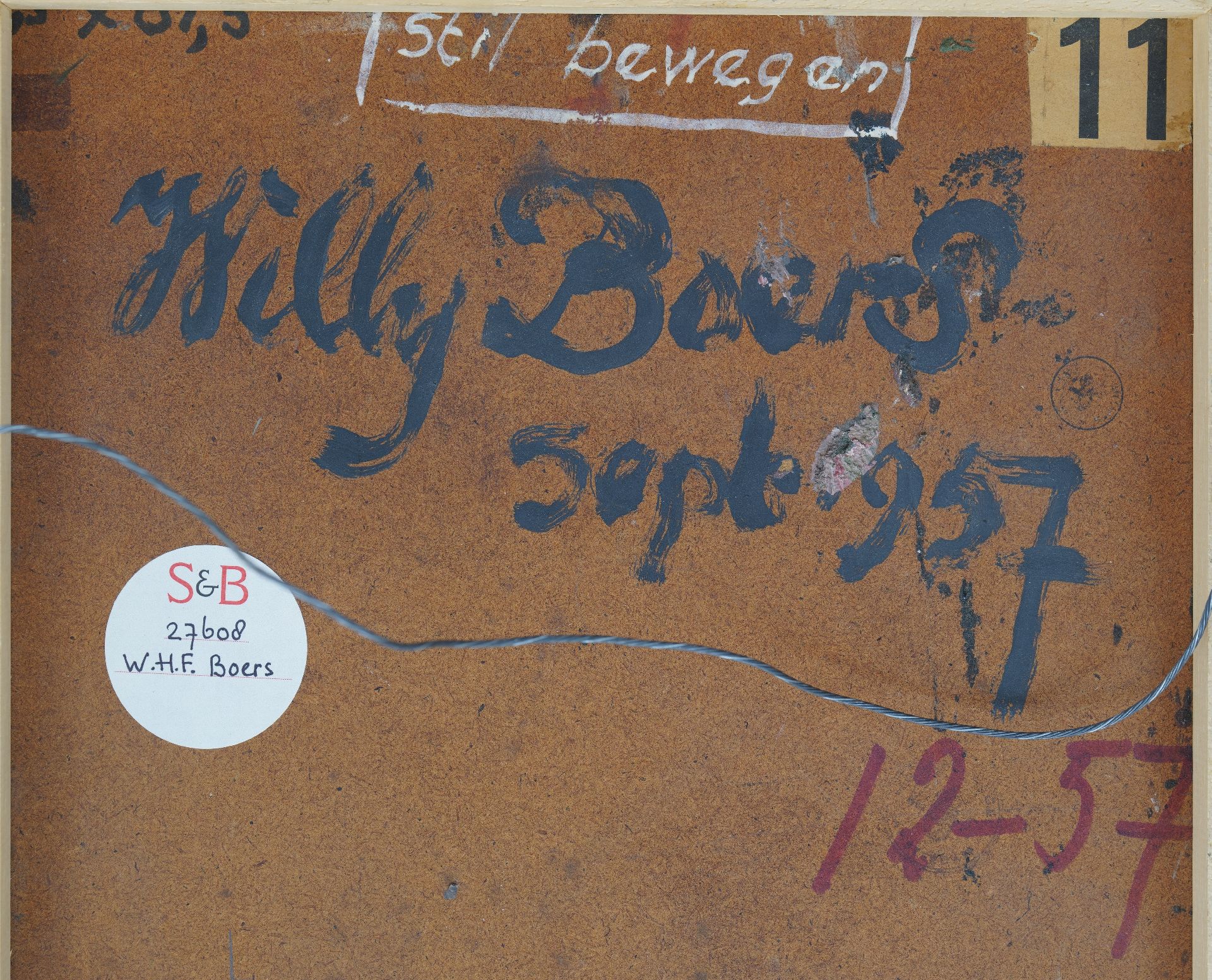 Der Amsterdamer Maler Willy Boers war einer der Schlüsselfiguren in der Erneuerung der Bildende Kunst in den Niederlanden nach dem II. Weltkrieg. Im Jahre 1946 war er Mitgründer der Gruppe Vrij Beelden, wozu u.a. auch Hussem, Roëde und Ouburg gehörten. Diese Gruppe exposierte regelmässig in dem Stedelijk Museum Amsterdam. Die Maler von Vrij Beelden wählten Experiment und Abstraktion, wobei sie auf den existierenden Strömungen wie Kubismus, Surrealismus und Expressionismus weiterbauten. Dies im Gegensatz zur Cobragruppe, die völlig mit der existierenden Bildsprache gebrochen hatte. Die Werke von Boers nach 1945 waren völlig abstrakt mit Einflüssen von Kandinsky. 1950 gründete er zusammen mit u.a. Rooskens und Brands die Gruppe Creatie, in der Experiment und Abstraktion auch wieder eine Rolle spielten. Auch war er nebst ein echter Maler ein begabter Schriftsteller, der eine Anzahl von erhellenden Aufsätzen über abstrakte Kunst verfasst hat.
