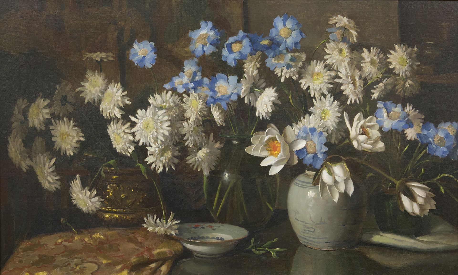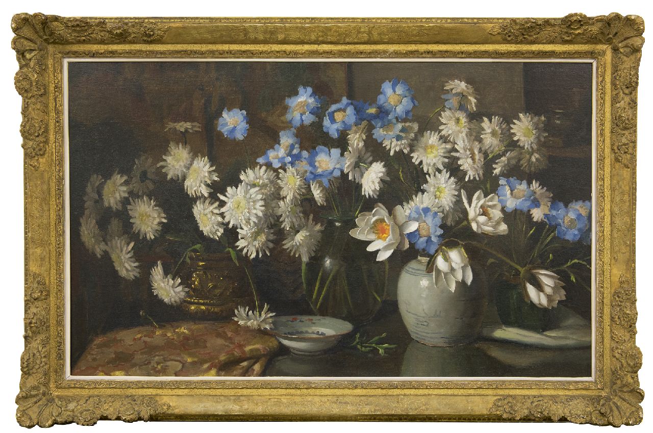 Willy Fleur Kunstwerk • Gemälde • zuvor zu verkaufen Blumenstilleben mit Margeriten, Scabiosen und Wasserrosen