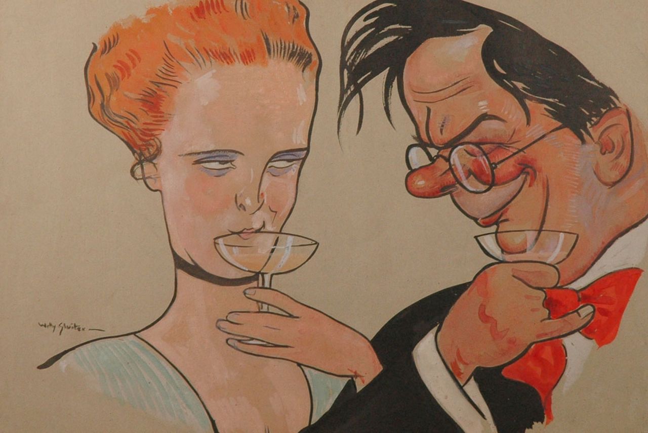 Willy Sluiter Kunstwerk • Aquarell • Zeichnung • zuvor zu verkaufen Bringing out a toast: dirigent Kees Dopper en Ellie Bysterus-Heemskerk