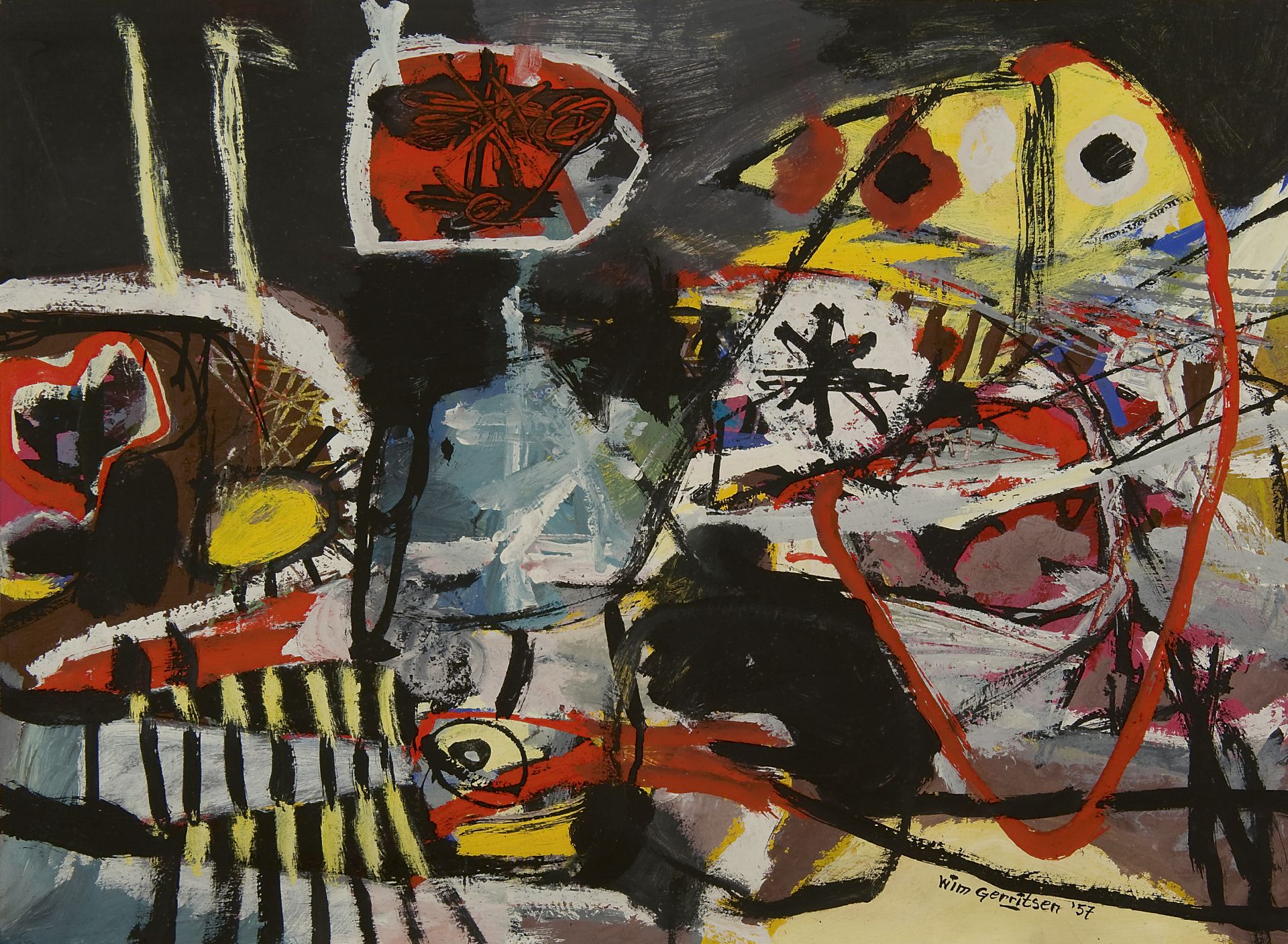 Der Arnheimer Maler Wim Gerritsen gehörte zu der Generation der nachkriegsen Künstler die sich in expressiven Formen und Farben mit der Wiedergabe des Unbewußten beschäftigten. Seine abstrakten Gouaches und Zeichnungen - manchmal voller wilden Bewegung- wurden wohl als Destruction Art (Absudismus) gekennzeichnet. Genau wie viele andere Maler wurde Gerritsen in den fünfziger Jahren von der Formensprache (phantastischen Vogel-Mensch-Kinderfiguren) der Cobra-Maler beeinflußt. Von dort entwickelte er seine eigene Bildsprache. Außer Gemälden in Ölfarben und Gouaches schuf Wim Gerritsen auch eine Anzahl Wandgemälde.