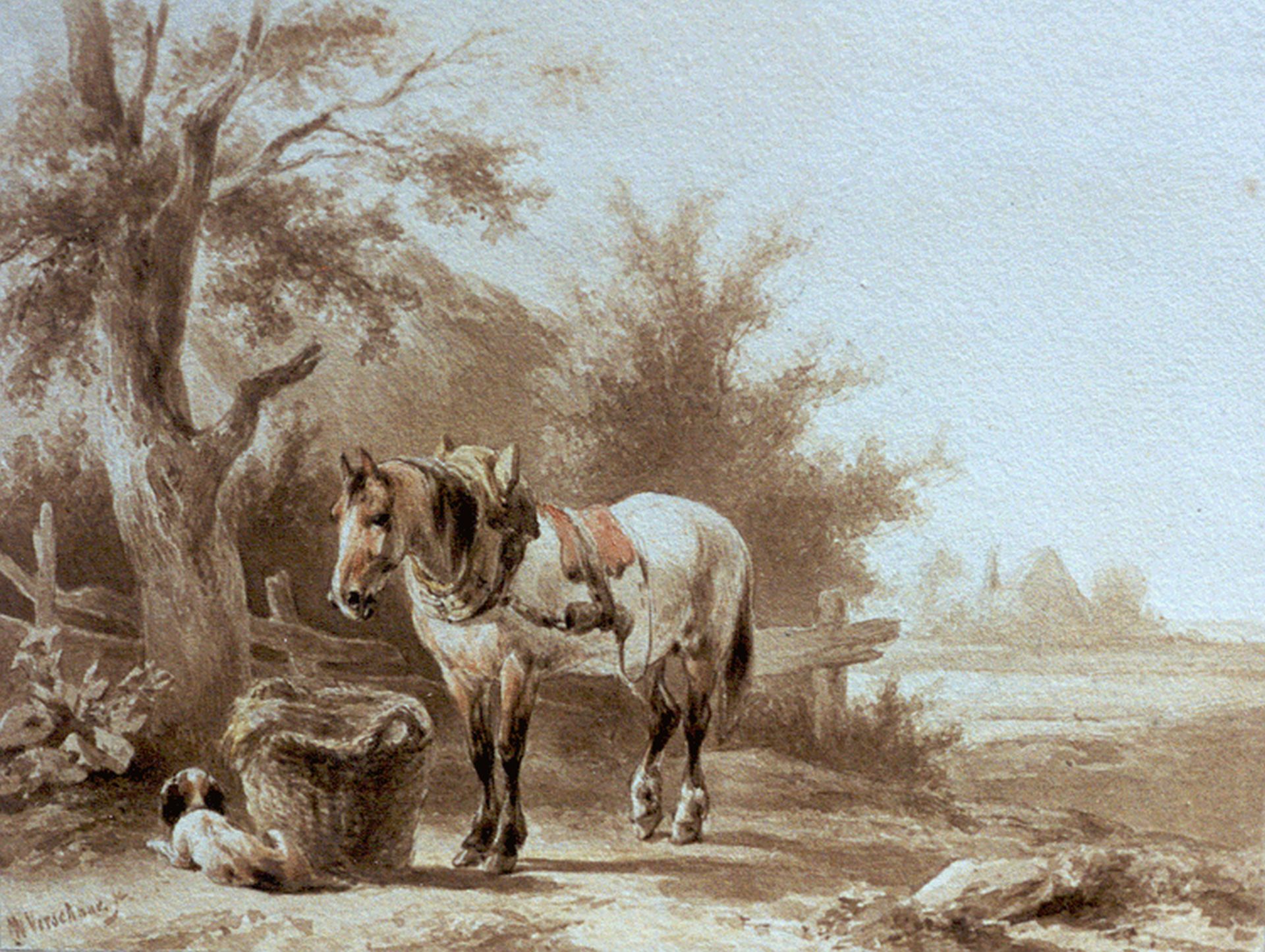 Wouterus Verschuur Kunstwerk • Aquarell • Zeichnung • zuvor zu verkaufen A horse and a dog in a landscape